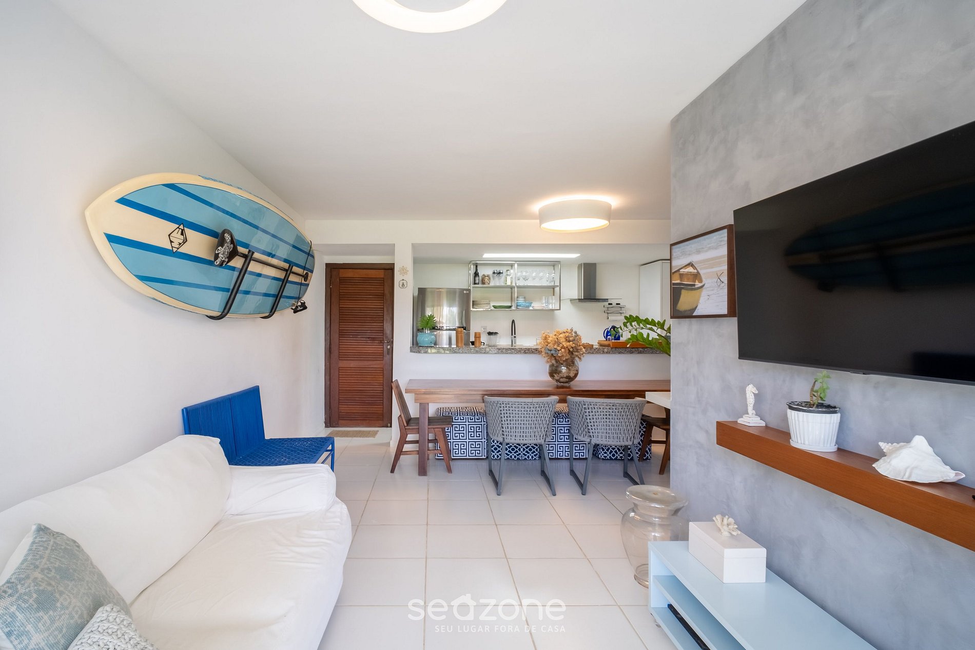 - Sala de estar com sofá, banco, Smart TV e ar-condicionado;