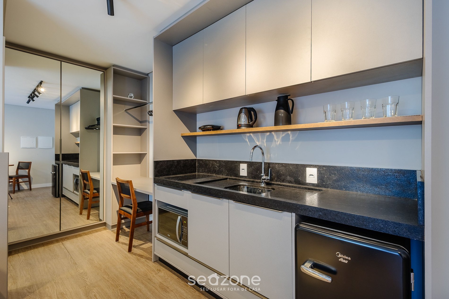 - Cozinha completa com frigobar, micro-ondas, sanduicheira, kit café (suporte para filtro, garrafa térmica), chaleira elétrica, liquidificador, taças de vinho, panelas, louças e utensílios;