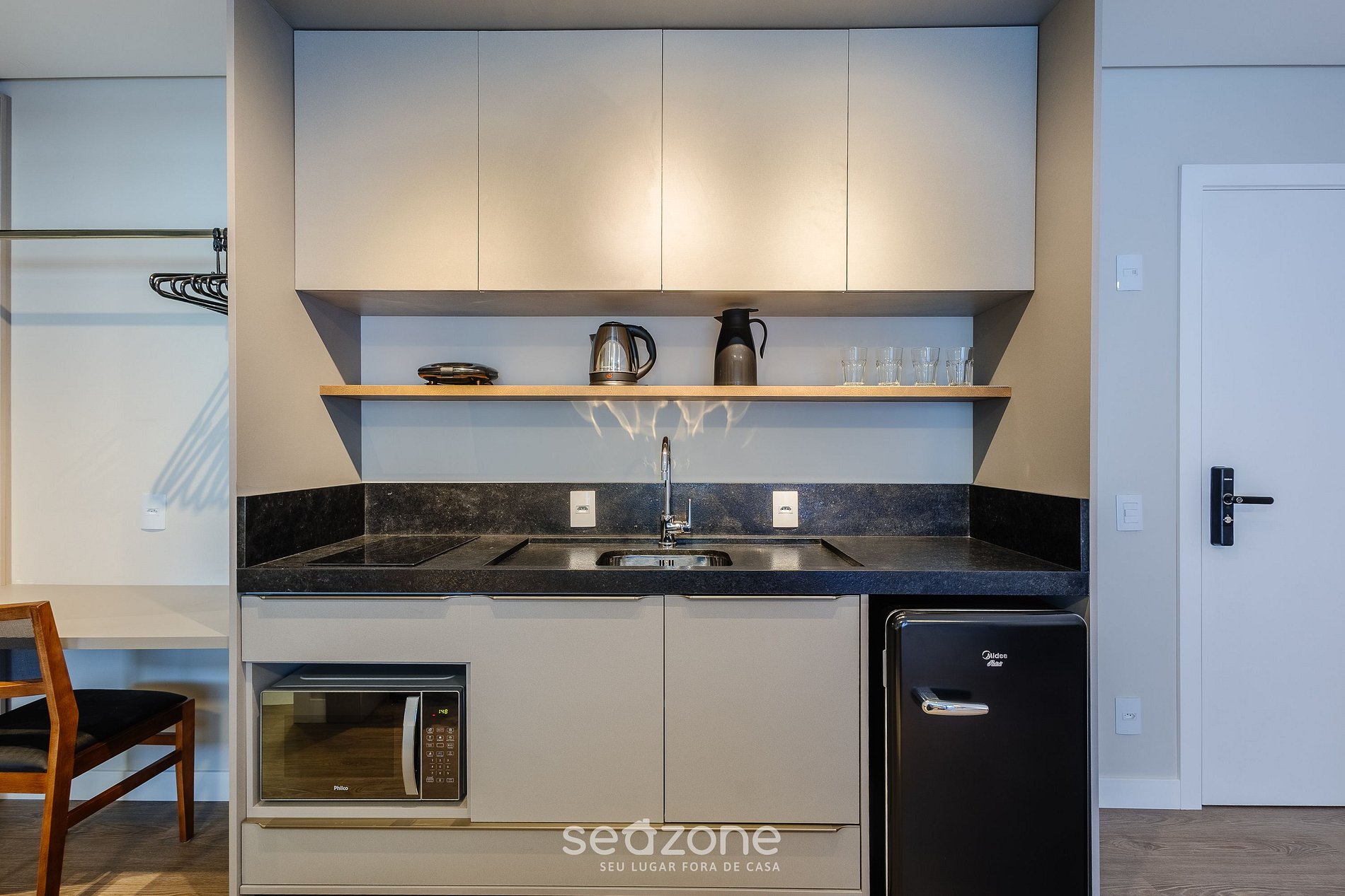 - Cozinha completa com frigobar, micro-ondas, sanduicheira, kit café (suporte para filtro, garrafa térmica), chaleira elétrica, liquidificador, taças de vinho, panelas, louças e utensílios;