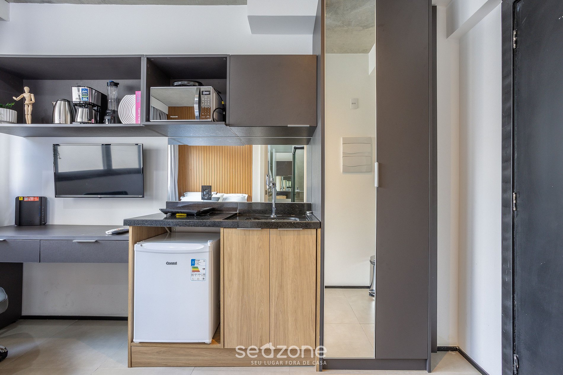 - Studio equipado com 01 cama de casal, Smart TV, armário e ar-condicionado;