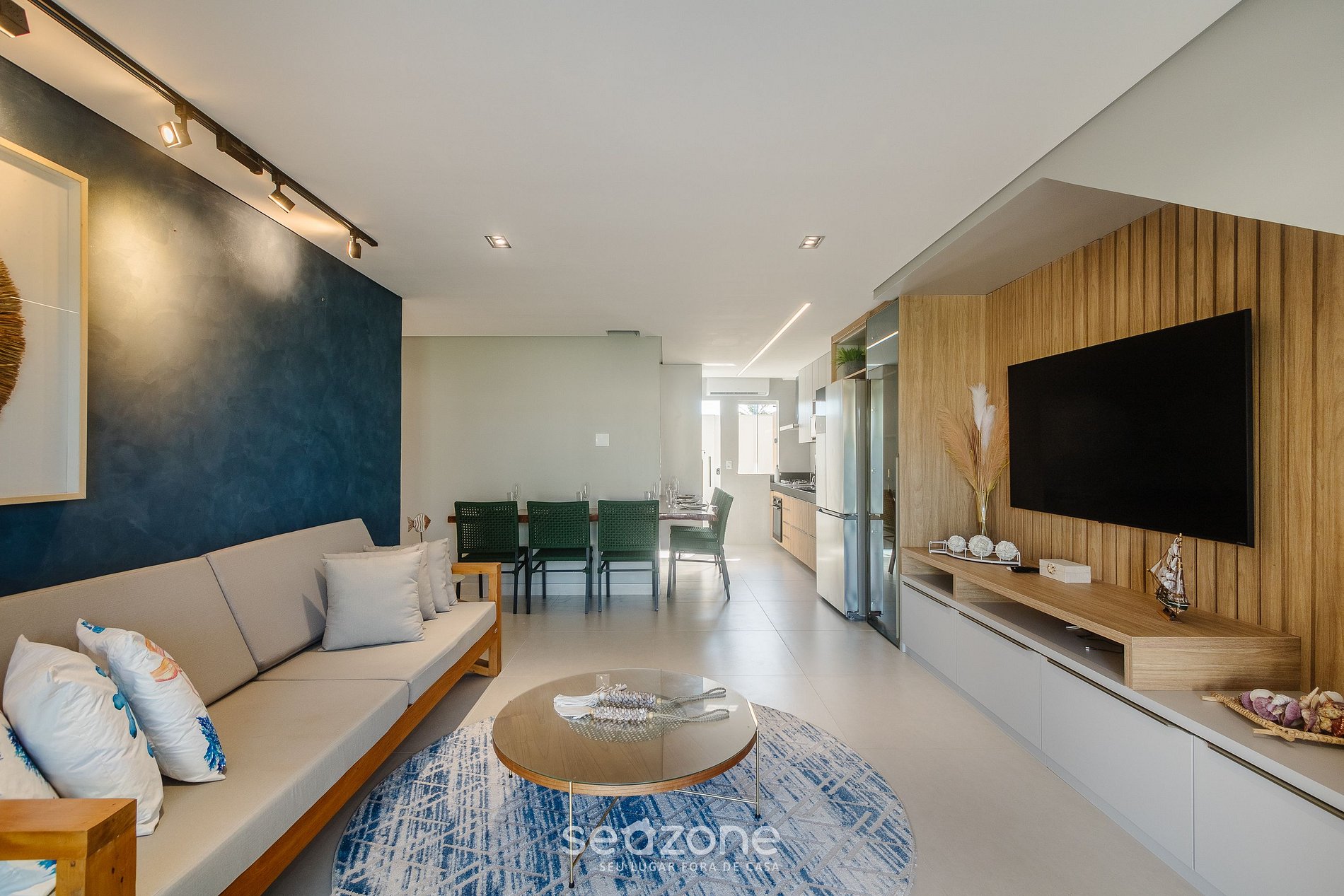 - Sala de estar com sofá, smart TV, adega elétrica e ar-condicionado;