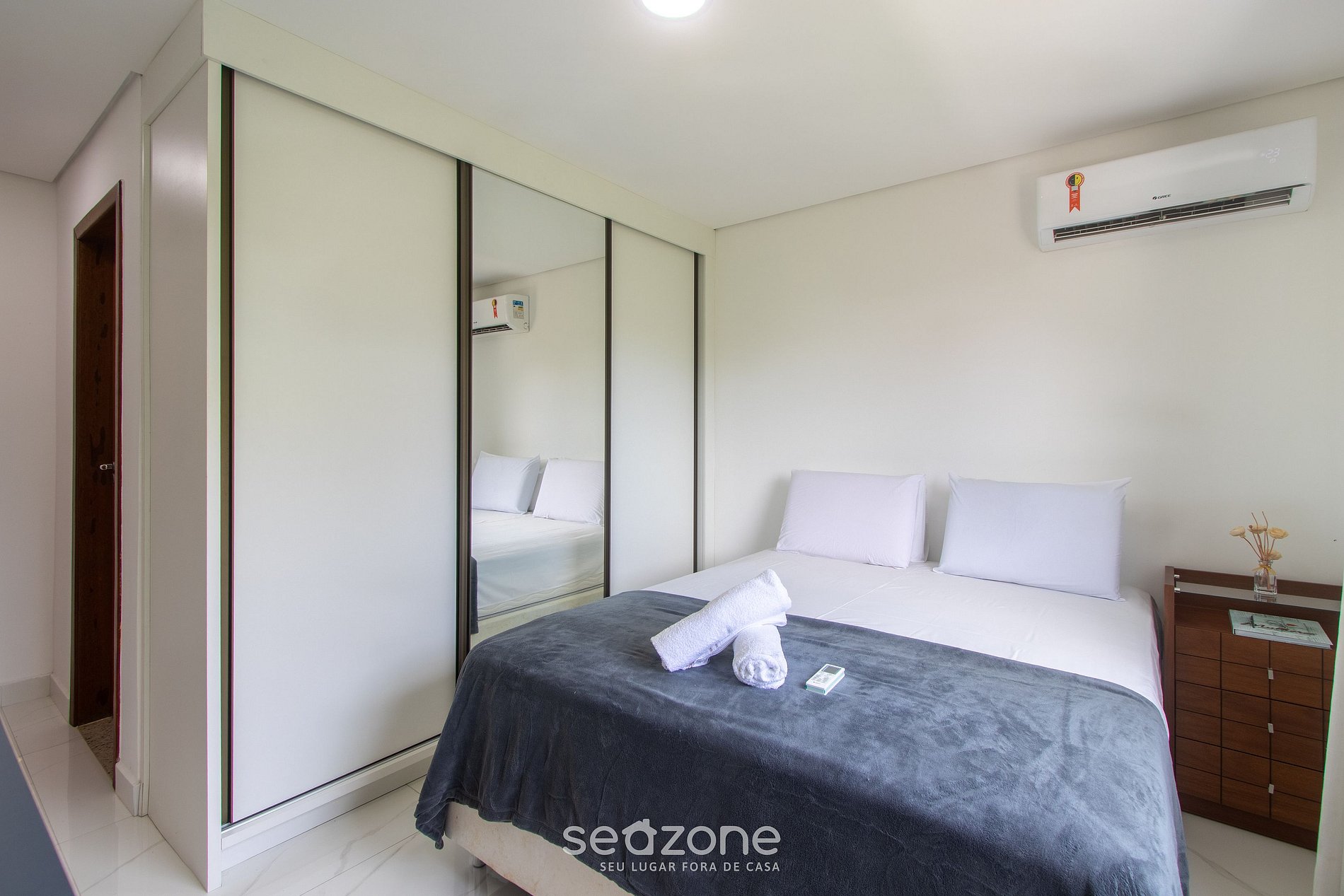 - 1 Suíte com cama de casal queen, armário e ar-condicionado;