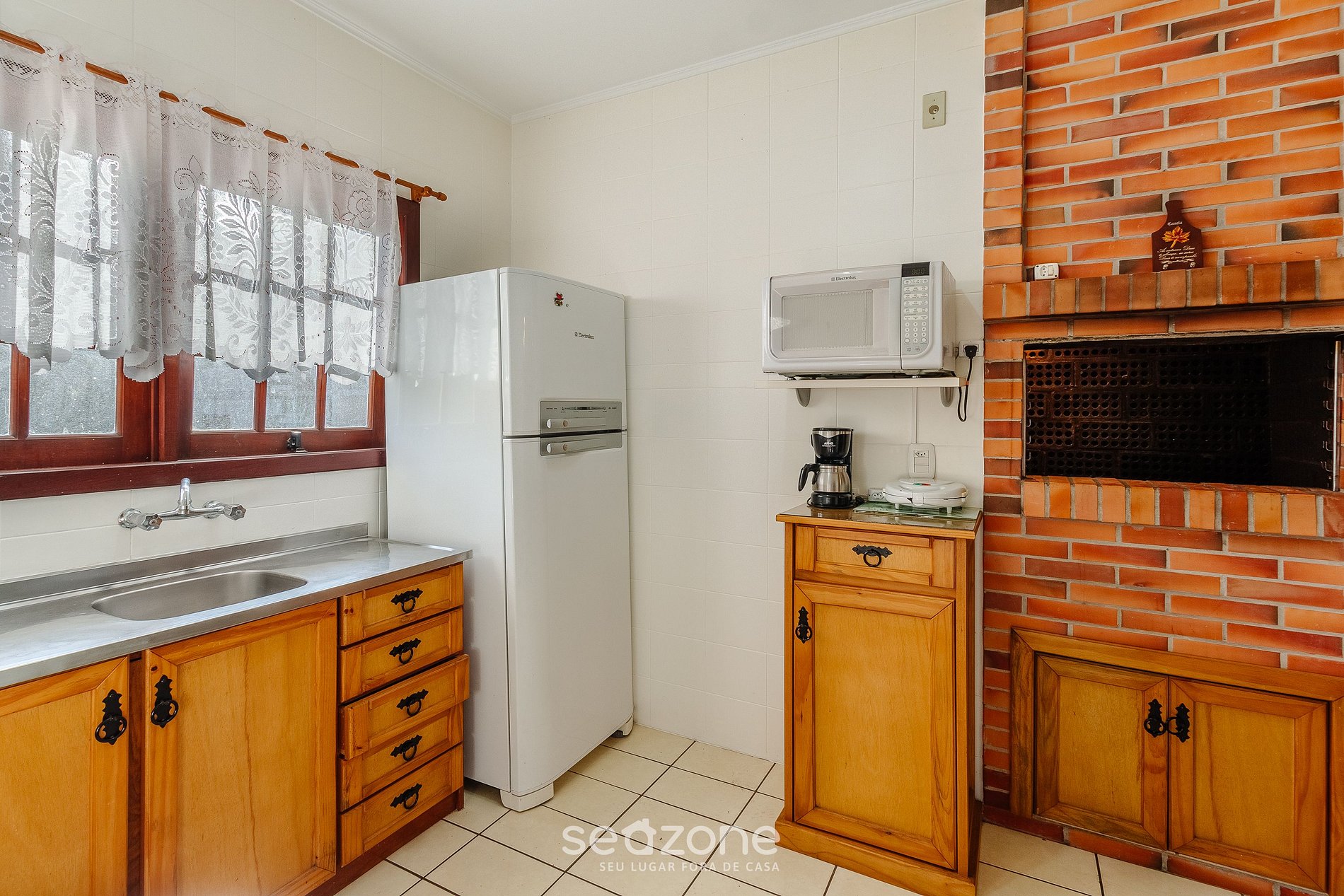 - Cozinha completa com geladeira, fogão, micro-ondas, cafeteira elétrica, churrasqueira, mesa para refeições e demais utensílios;