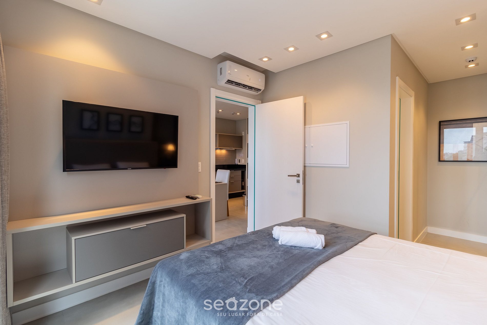 - 1 Quarto com cama queen size, cortinas blackout, armário, Smart TV de tela plana e ar-condicionado;