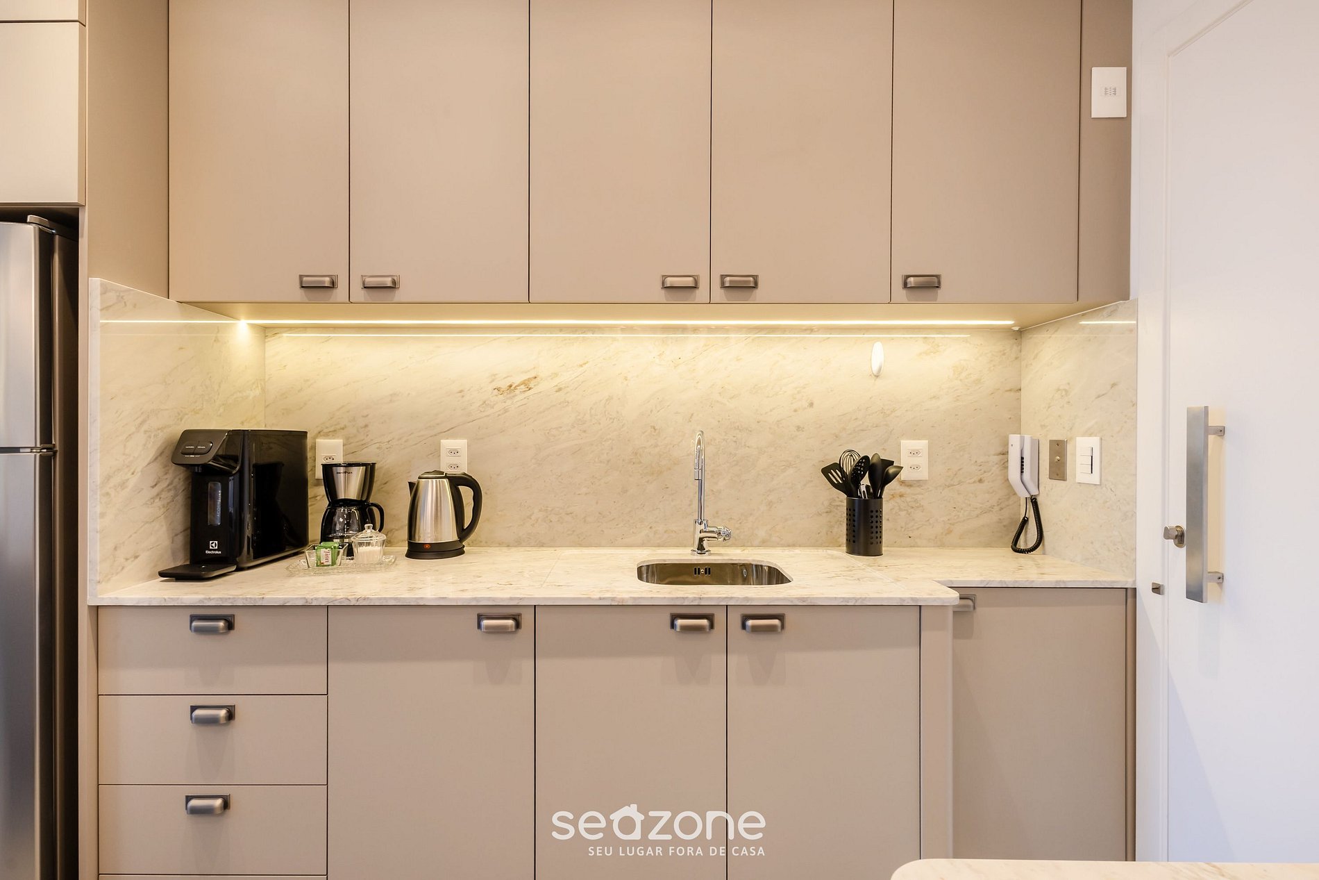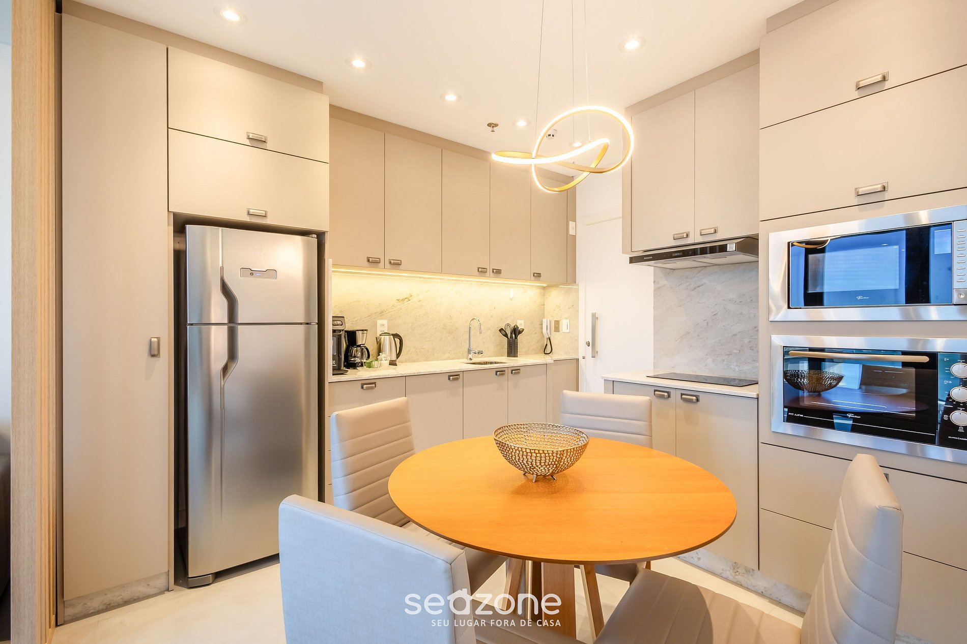 - Cozinha completa com geladeira, fogão cooktop por indução, forno elétrico, microondas, sanduicheira, cafeteira elétrica, chaleira elétrica, liquidificador, filtro de água, taças de vinho, panelas, louças e utensílios;