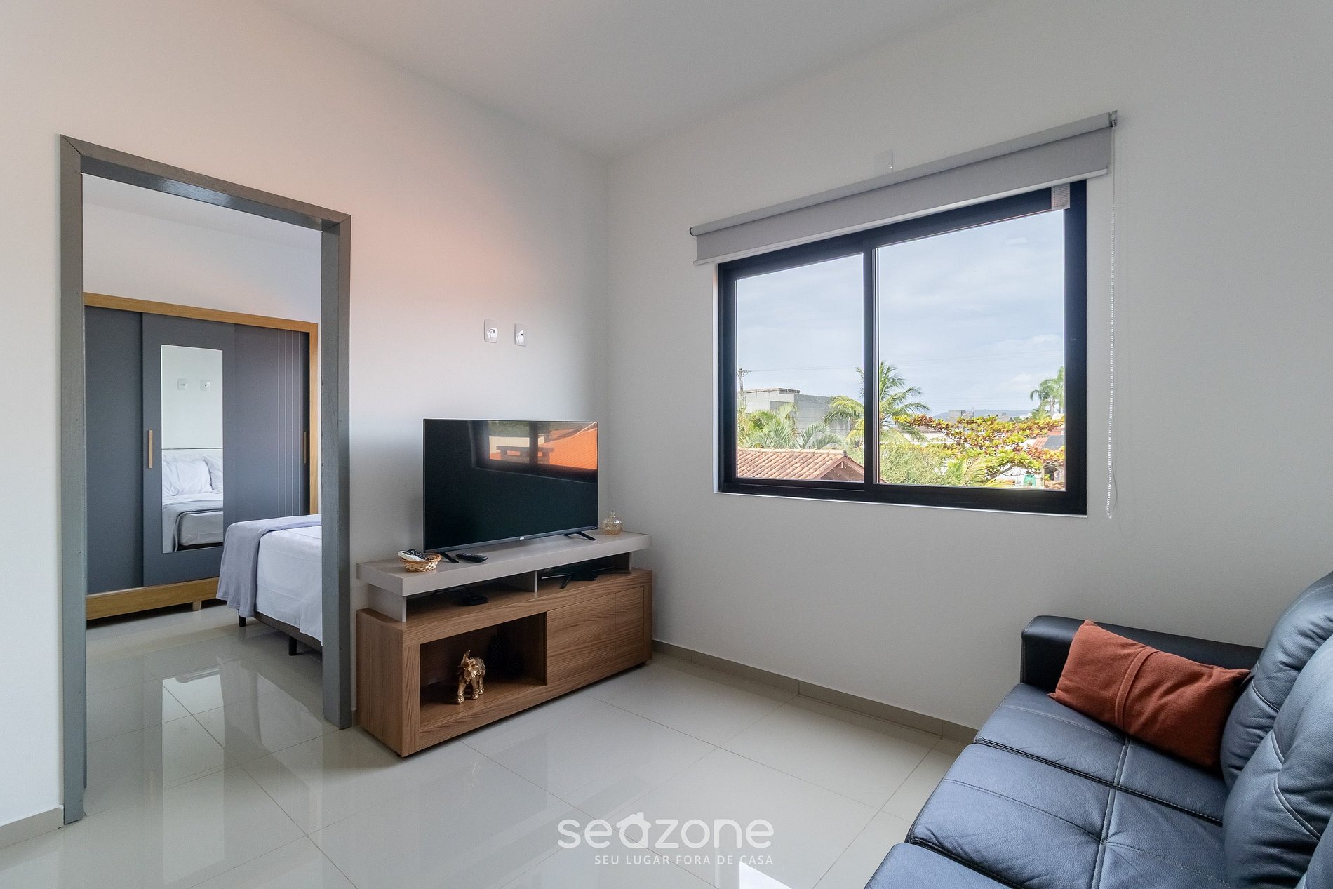 - Sala de estar com sofá e Smart TV;