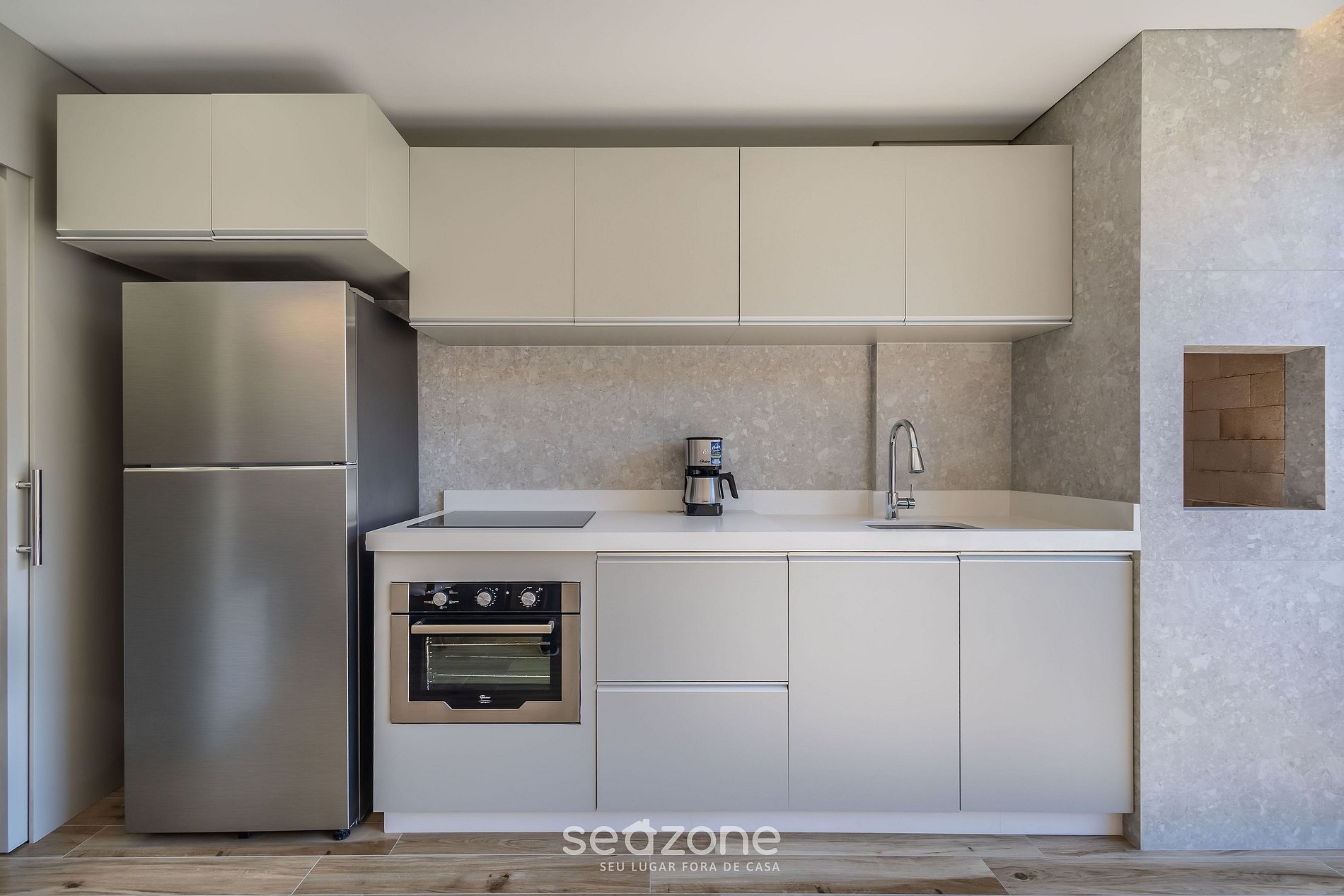- Cozinha completa com geladeira, fogão cooktop (indução), forno elétrico, micro-ondas, sanduicheira, chaleira elétrica, liquidificador, taça de vinho, panelas, louças e utensílios;