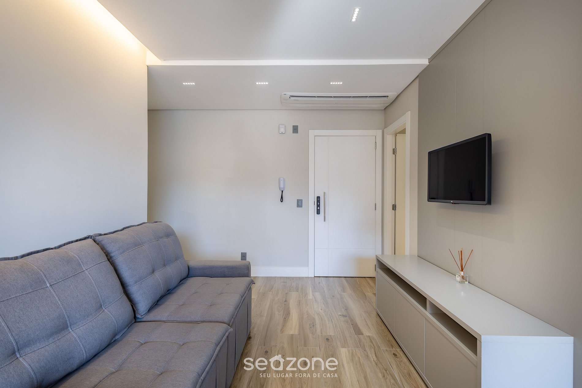 - Sala de estar com sofá, Smart TV e ar-condicionado;
