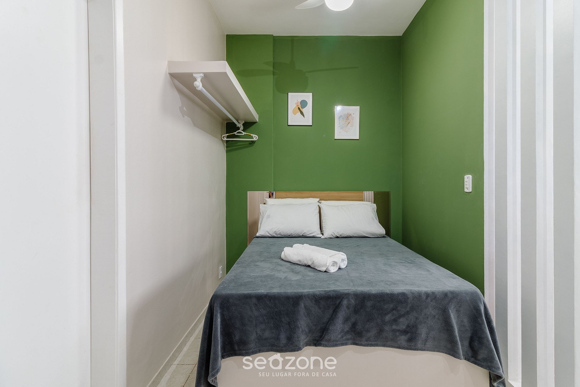 - Studio com cama de casal, arara para roupas e ventilador de teto;