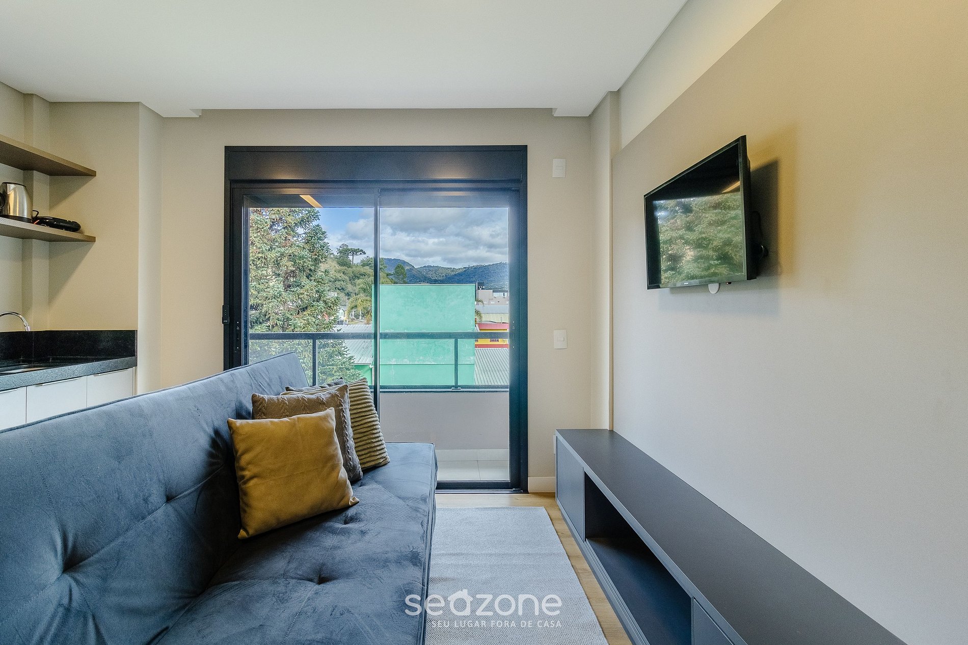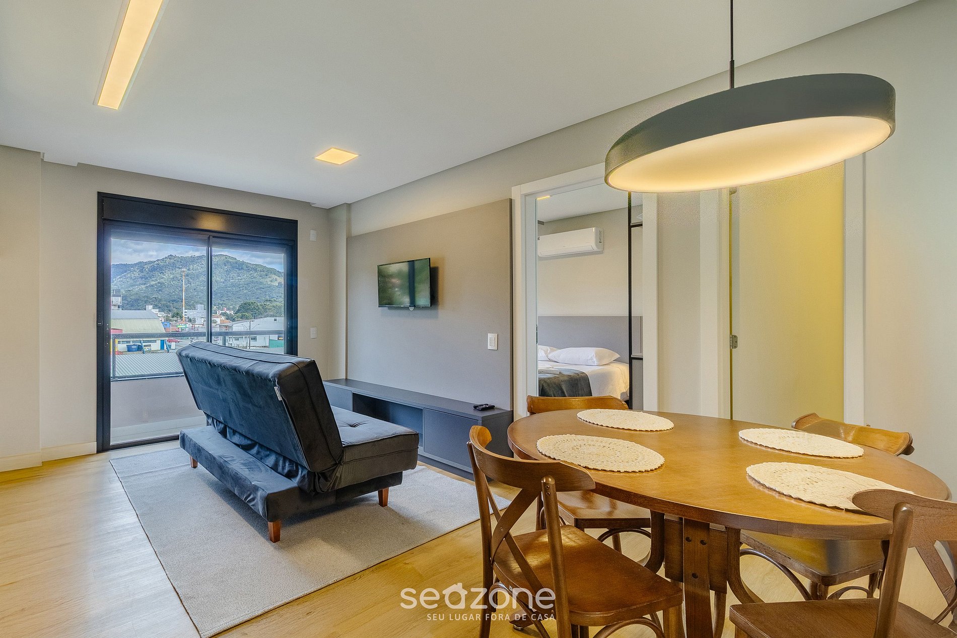 Apto moderno com vista para a montanha e cidade.