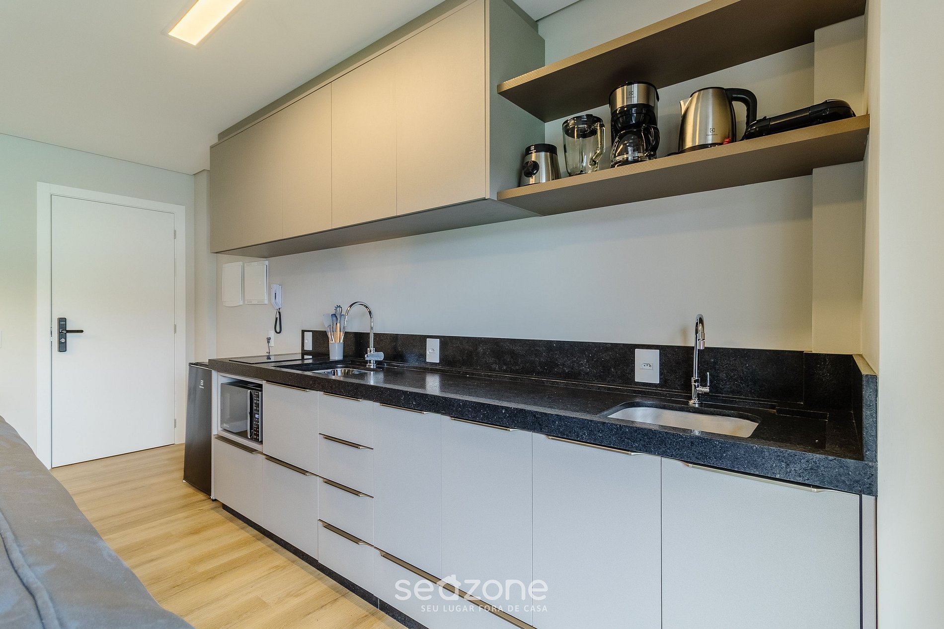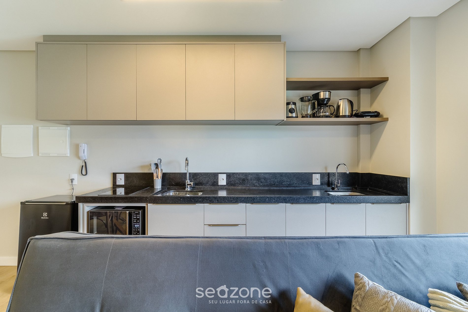 - Cozinha completa com frigobar, fogão cooktop por indução, microondas, sanduicheira, cafeteira elétrica, chaleira elétrica, liquidificador, taças de vinho, panelas, louças e utensílios;