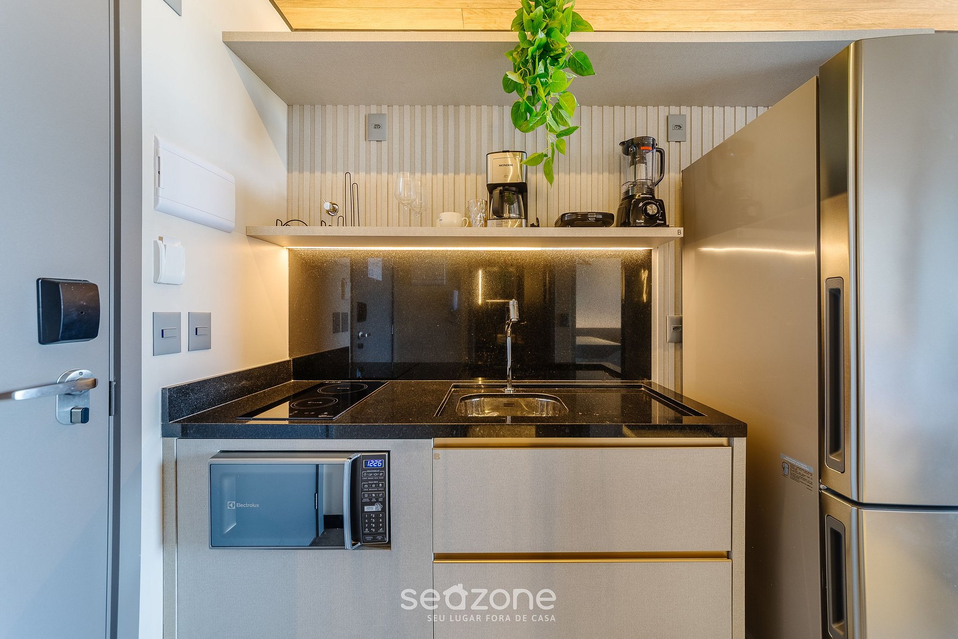 - Cozinha com geladeira, fogão cooktop (indução), micro-ondas, cafeteira elétrica, liquidificador, panelas, louças e utensílios;