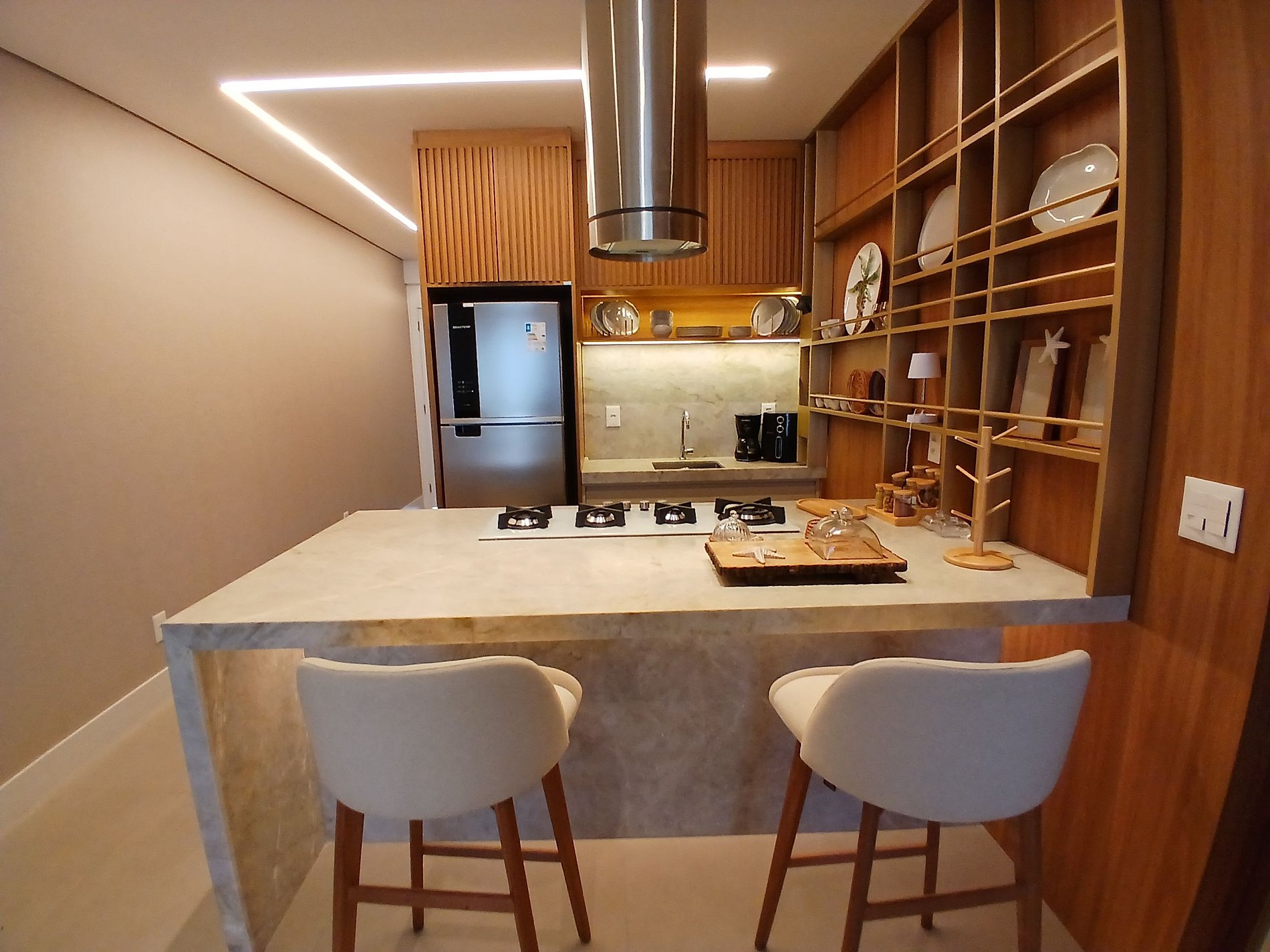 - Cozinha completa com geladeira, cooktop (gás), micro-ondas, Airfryer, Cafeteira elétrica e Nespresso, liquidificador, taças de vinho, panelas, louças e utensílios;