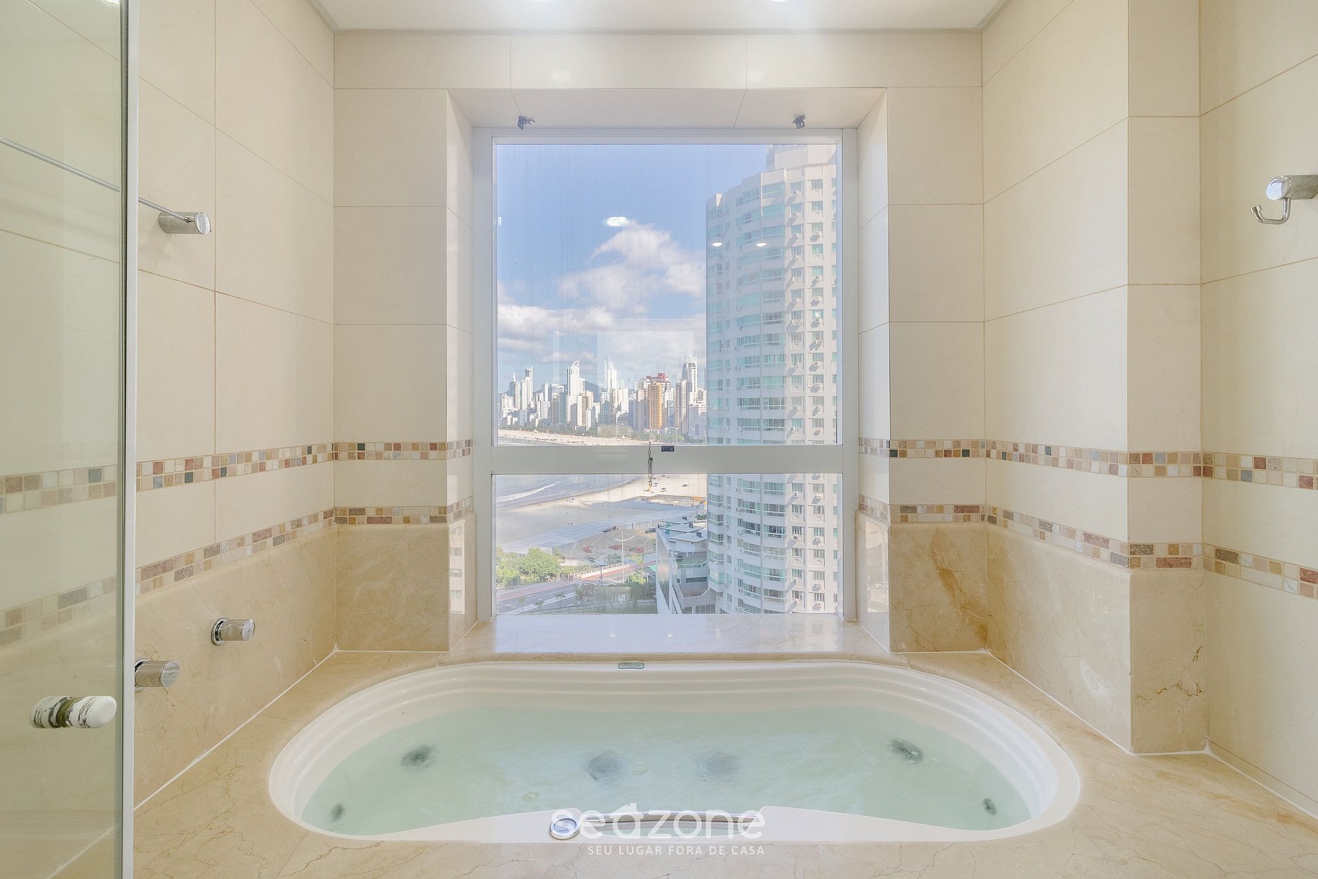 A apenas 230m da praia, conta com 3 suítes climatizadas, sendo uma com hidromassagem, sala de estar, cozinha completa e área gourmet com churrasqueira para momentos especiais. O espaço ainda conta com uma vista panorâmica do mar e da roda gigante.