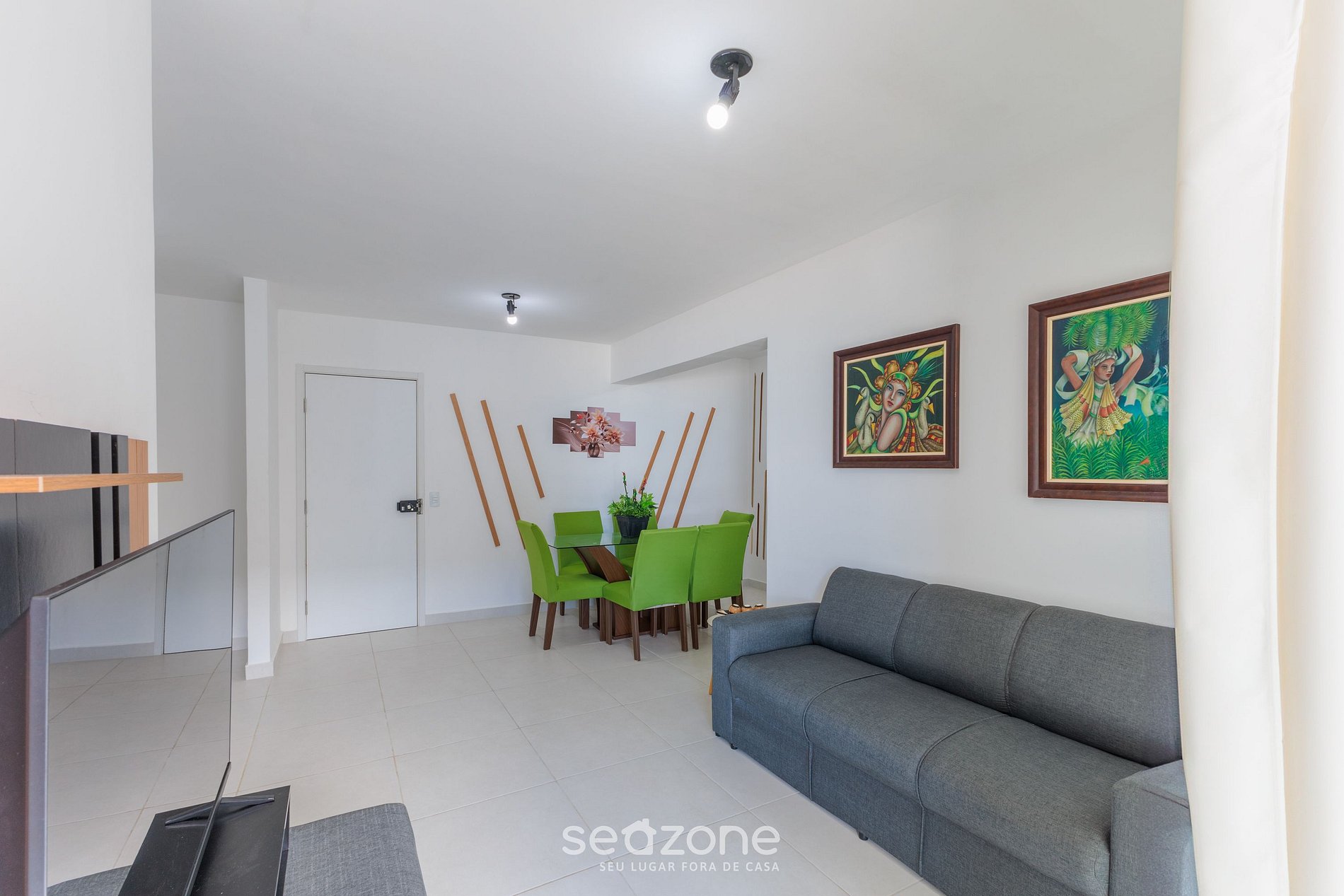 - Sala de estar com sofá e Smart TV;