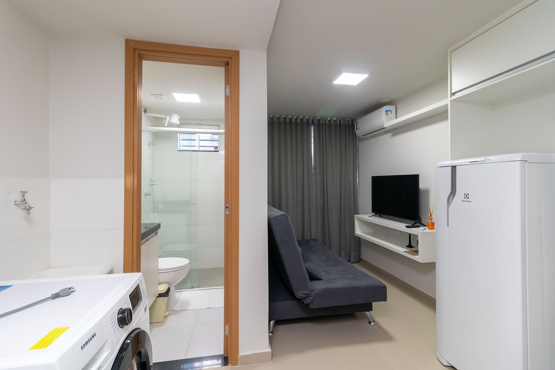 - Sala de estar com sofá cama, Smart TV e cortinas blackout;