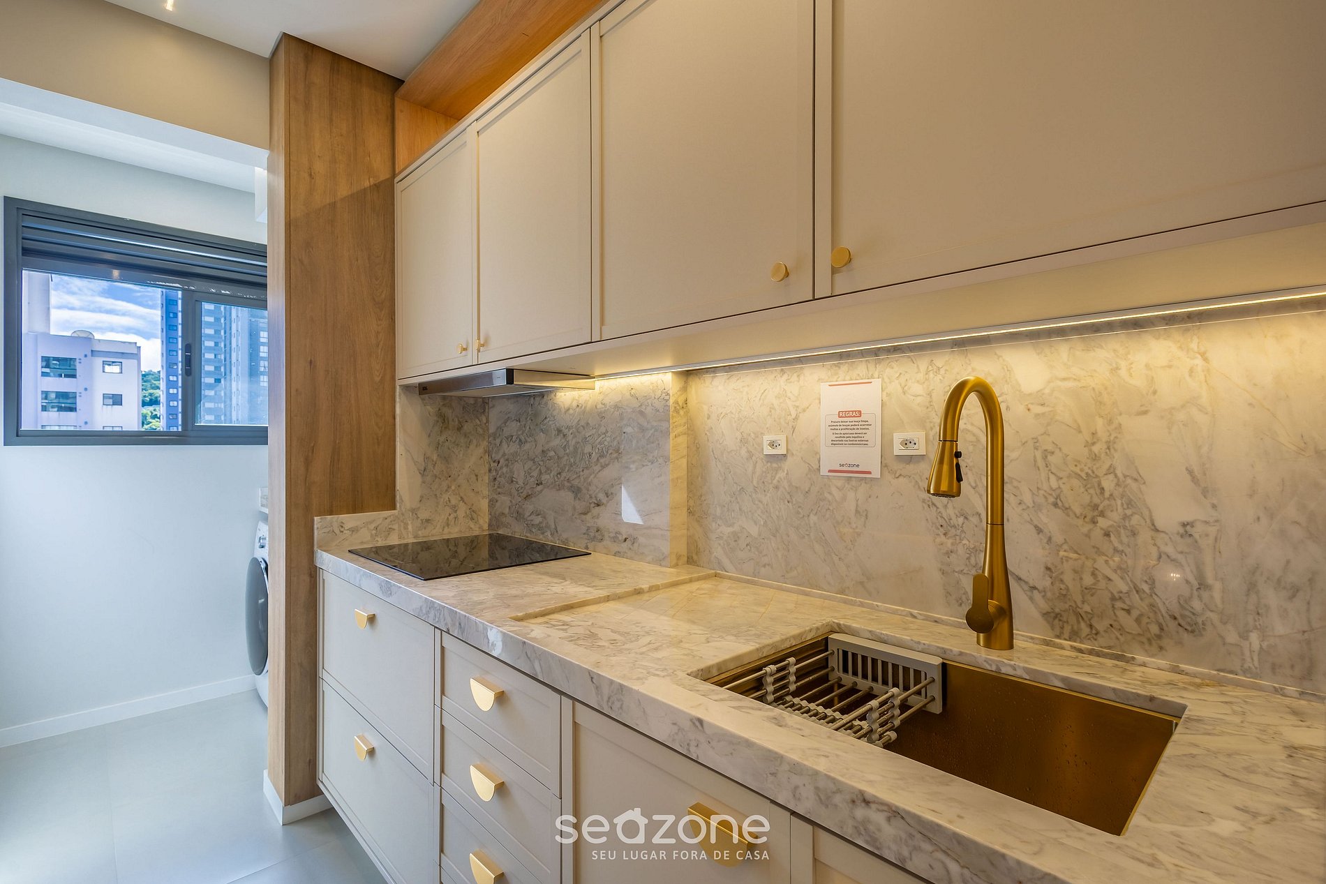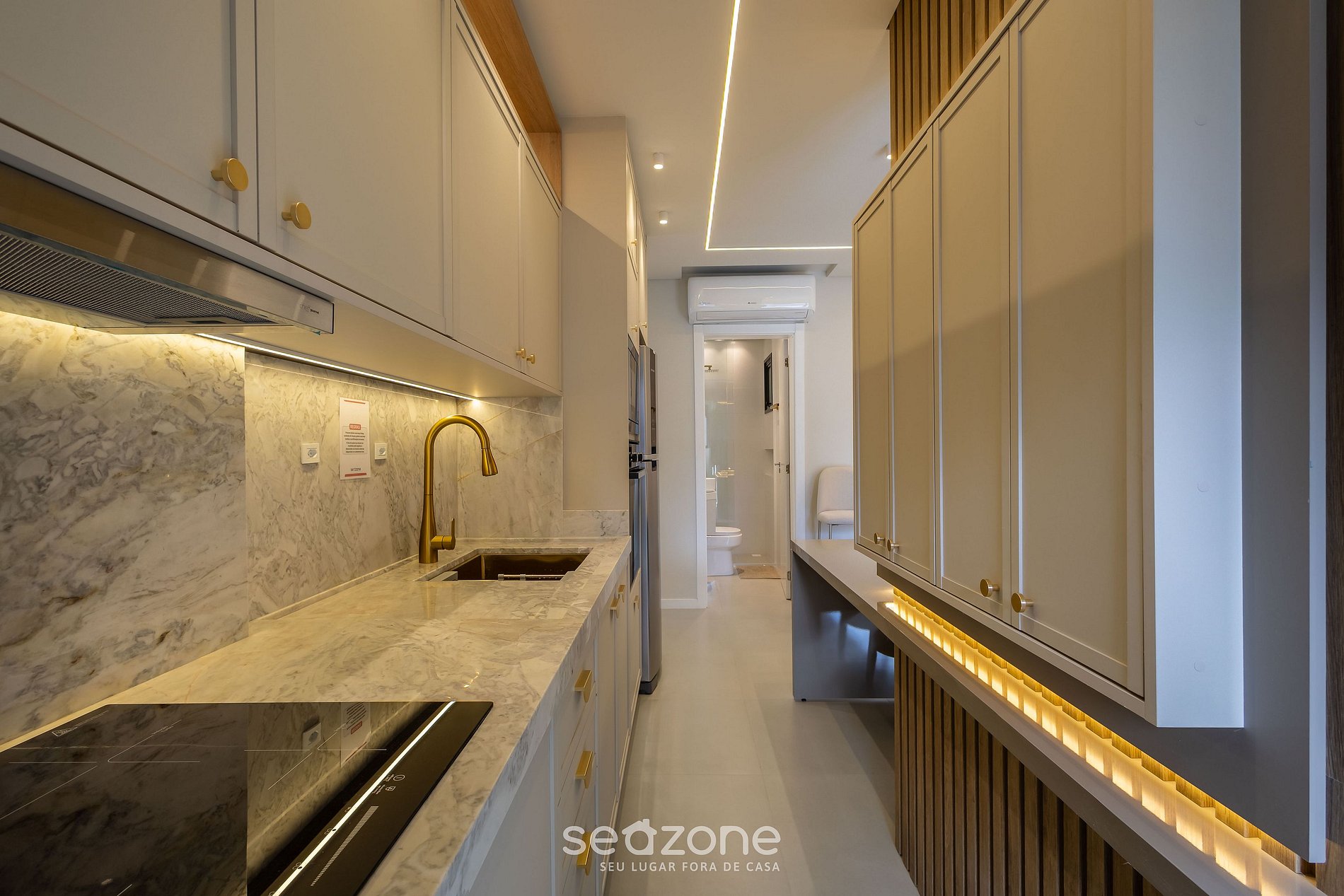 - Cozinha completa com geladeira, fogão cooktop (indução), forno elétrico, micro-ondas, sanduicheira, kit café (suporte para filtro, garrafa térmica), chaleira elétrica, liquidificador, panelas, louças e utensílios;