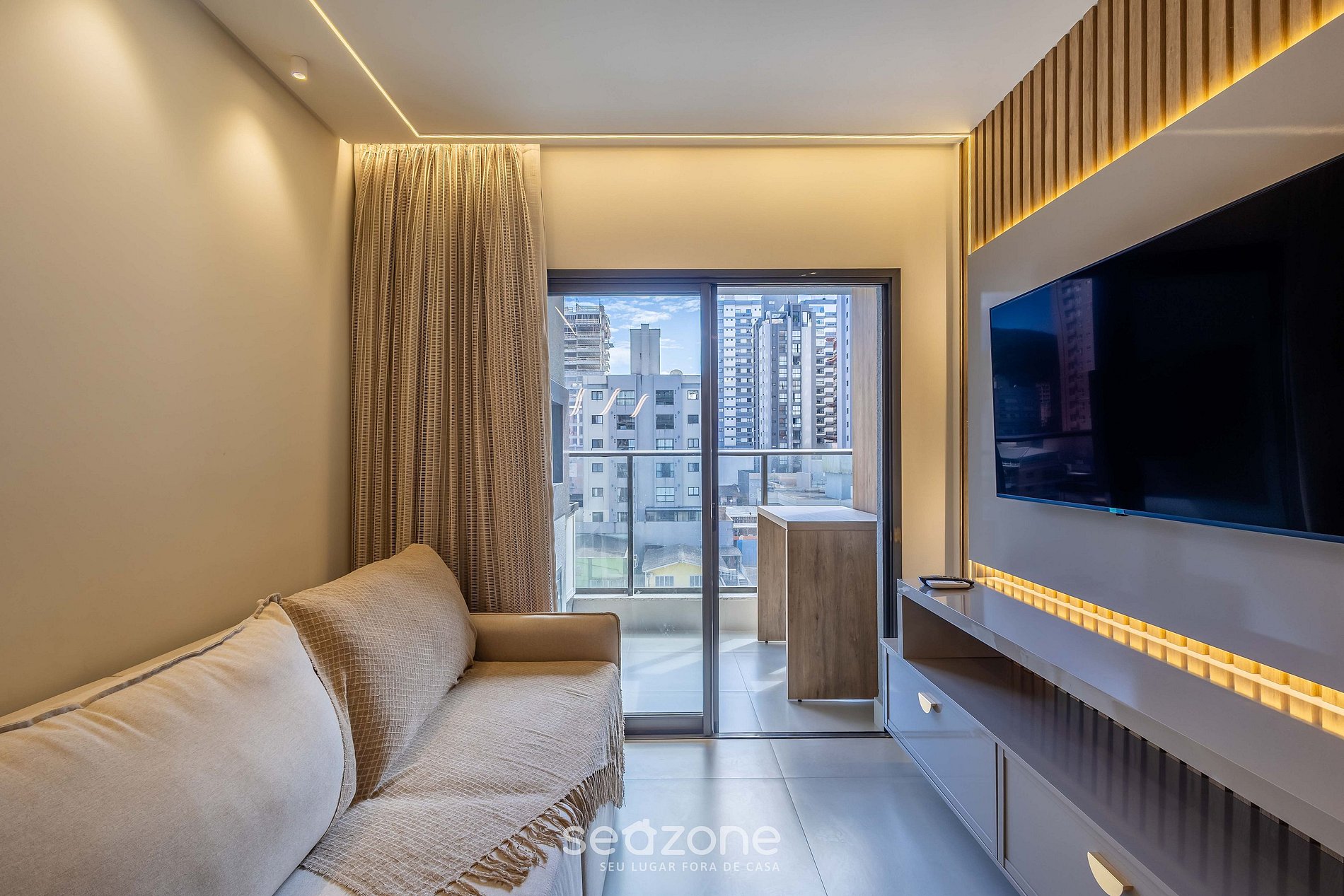 - Sala de estar com sofá, Smart TV e ar-condicionado;