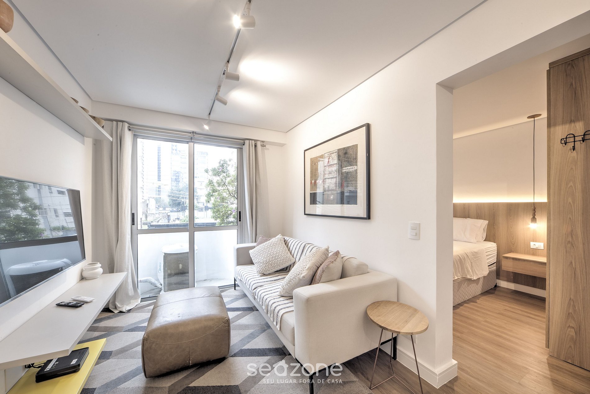 - Sala de estar com sofá, Smart TV e ar-condicionado;