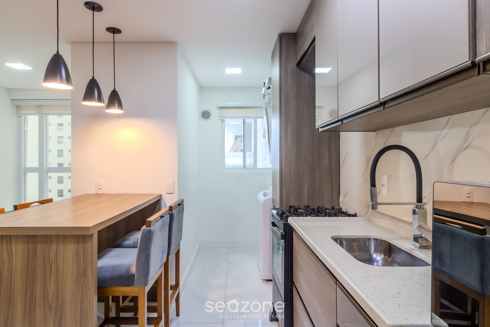 - Cozinha completa com geladeira, fogão, forno, micro-ondas, sanduicheira, Kit café (suporte para filtro, garrafa térmica), chaleira elétrica, liquidificador, taças de vinho, panelas, louças e utensílios;