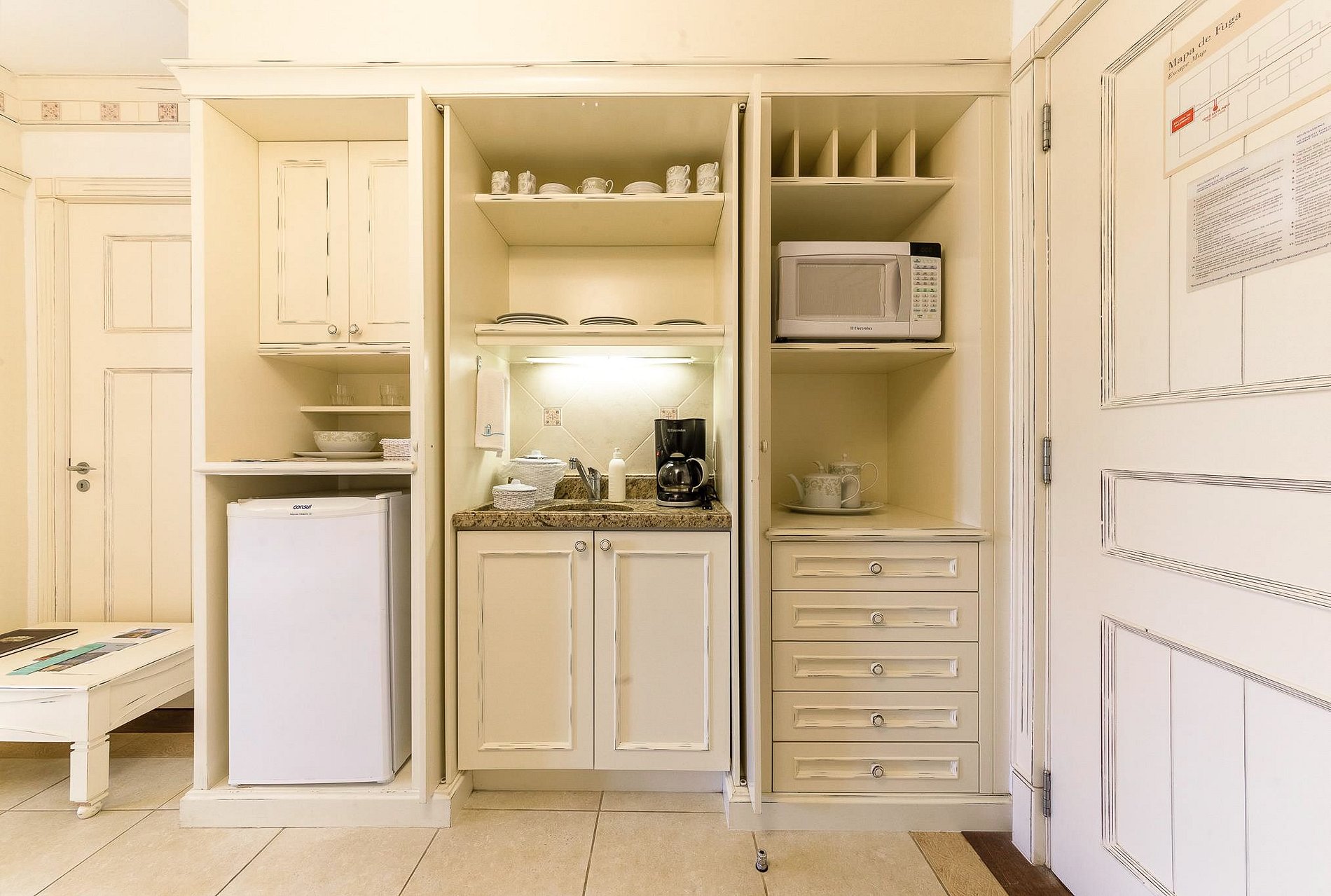- Mini cozinha com micro-ondas, frigobar e utensílios domésticos;