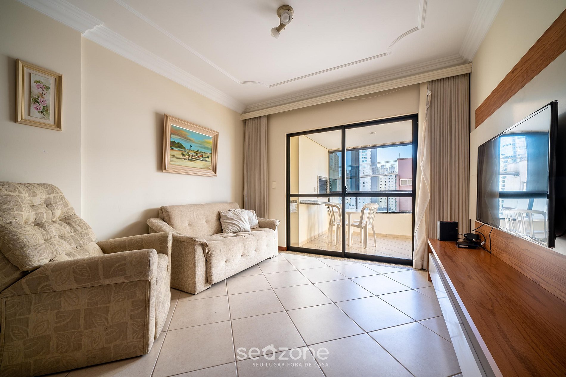- Sala de estar com sofá, poltronas e TV de tela plana;