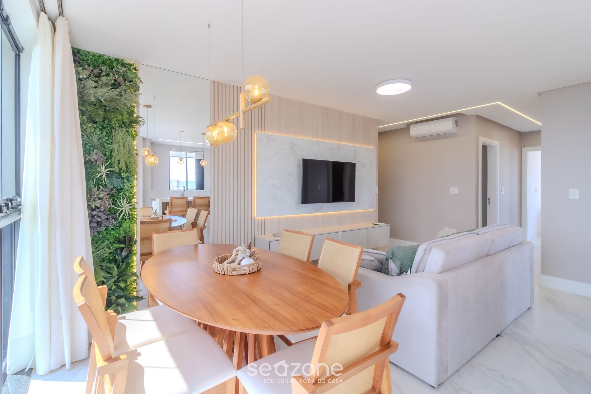 - Sala de estar com sofá, Smart TV e ar-condicionado;