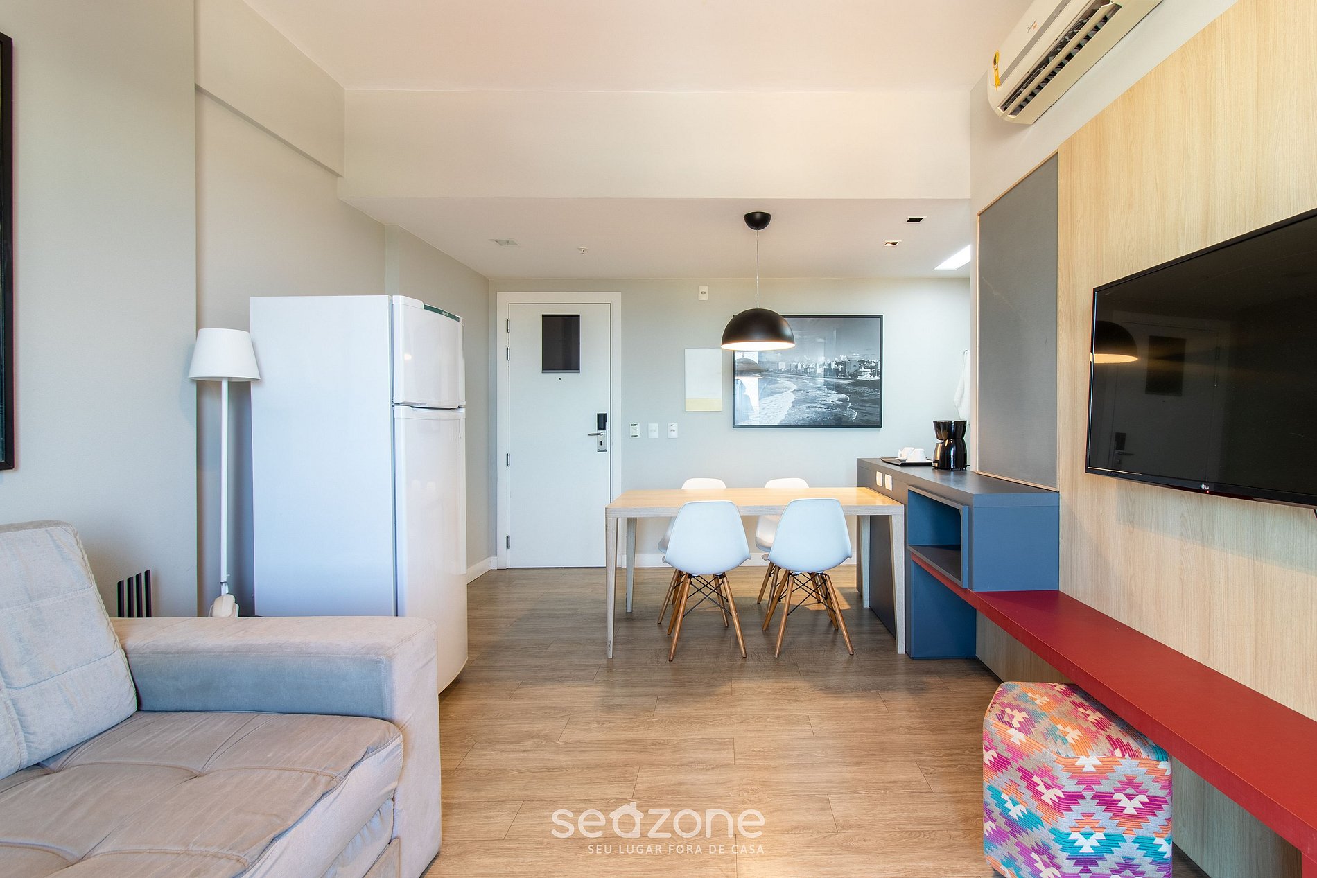 - Sala de estar com sofá-cama de casal, Smart TV e ar-condicinado;