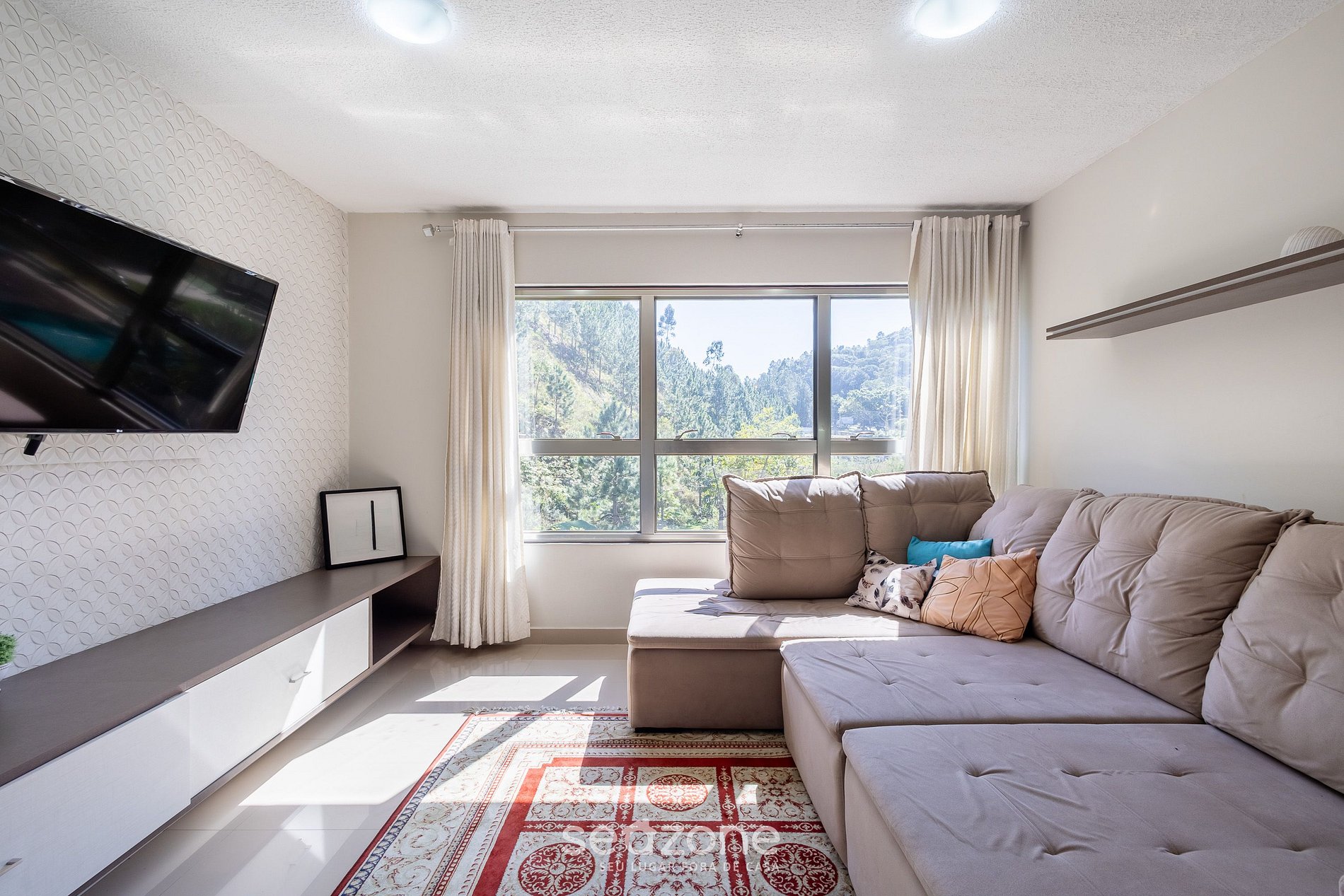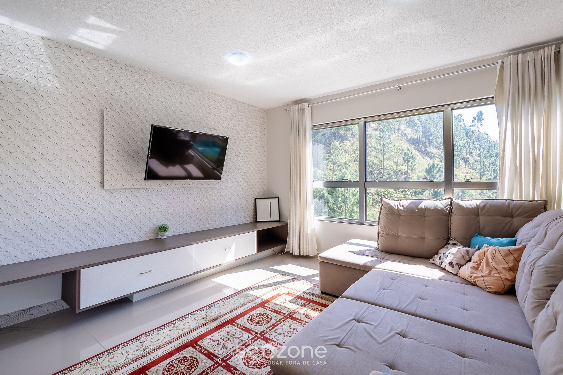 - Sala de estar com sofá, Smart TV e ar-condicionado;