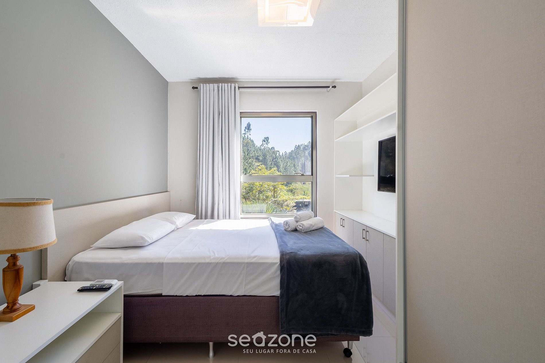 - 1 Quarto com cama queen, bancada e ar-condicionado;
