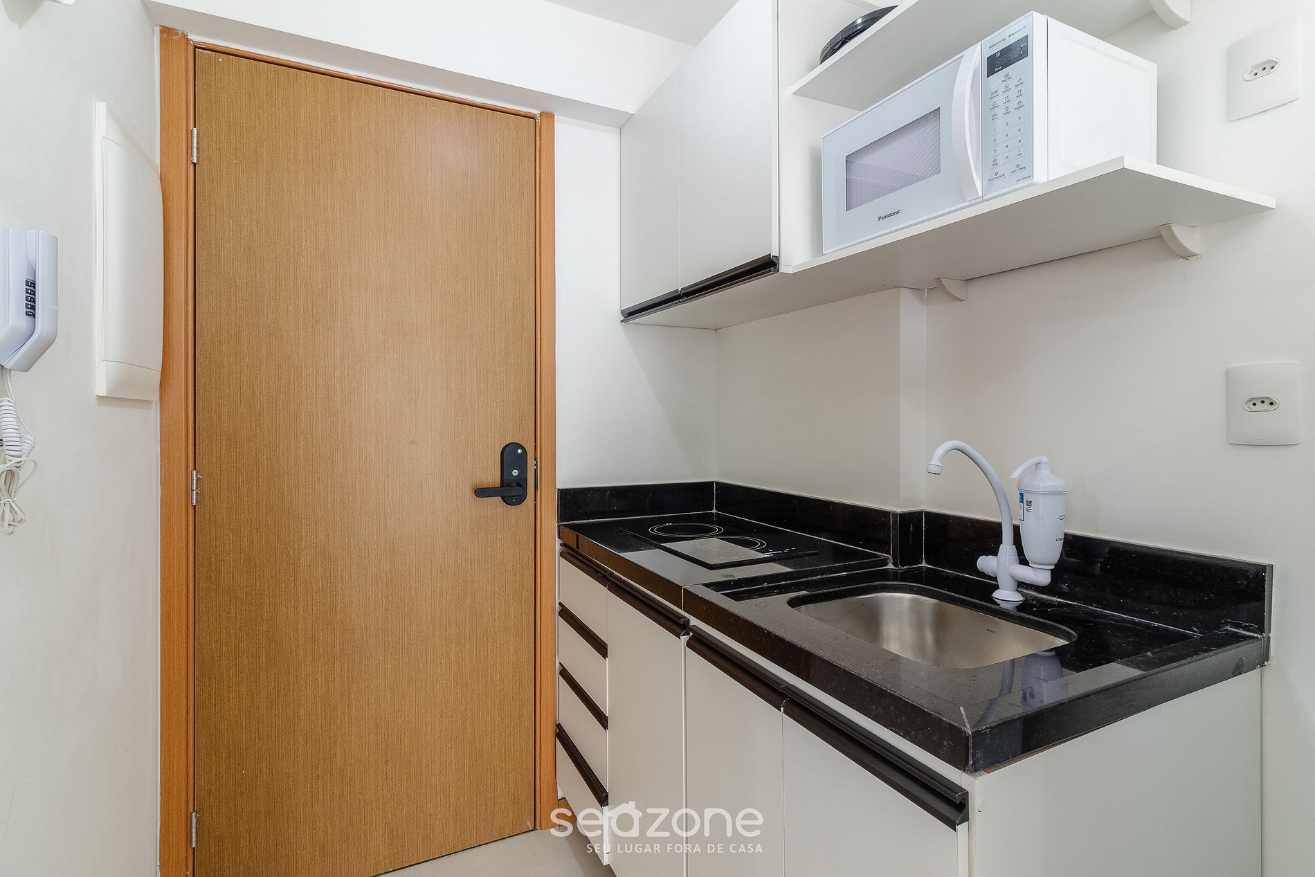 - Cozinha completa com geladeira, fogão cooktop, cafeteria, micro-ondas, sanduicheira, Kit café (suporte para filtro, garrafa térmica), liquidificador, panelas, louças e utensílios;