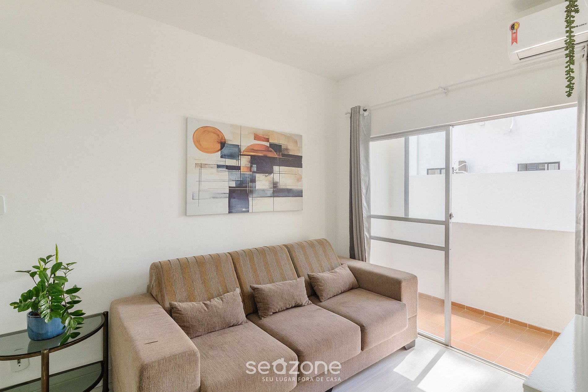 - Sala de estar com sofá, Smart TV e ar-condicionado;
