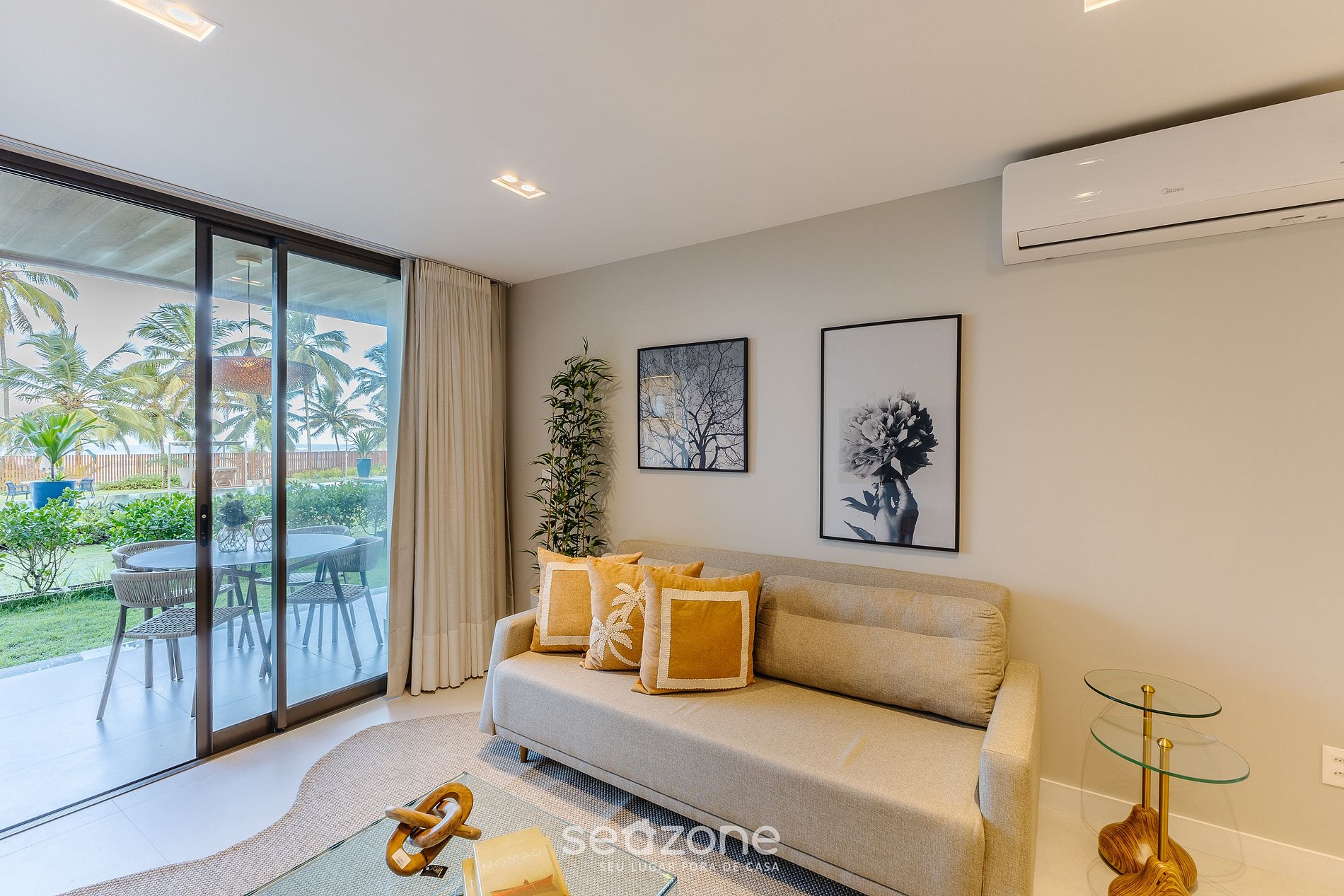 - Sala de estar com sofá, Smart TV e ar-condicionado;