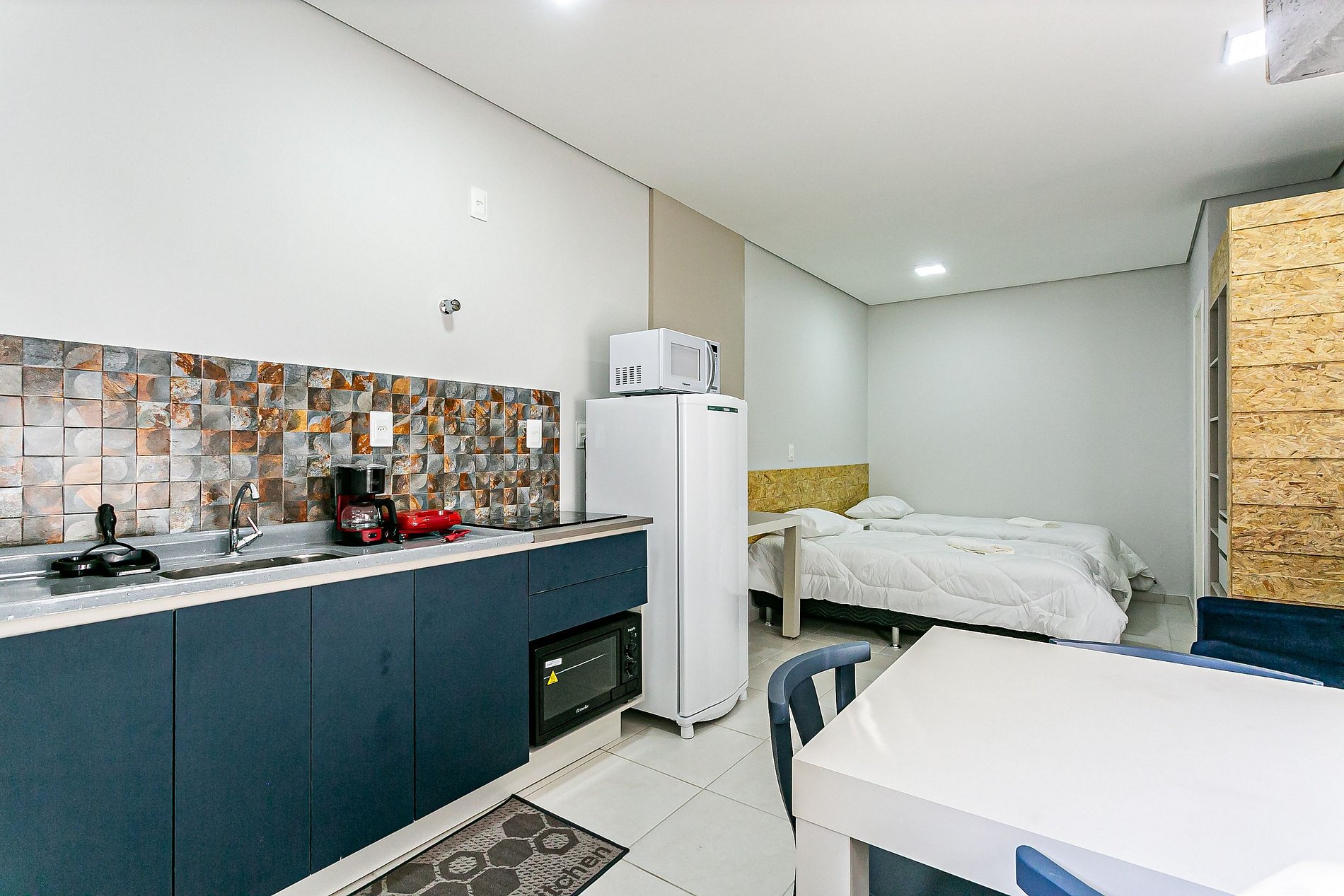 - Cozinha completa com fogão cooktop 2 bocas, geladeira, micro-ondas, forno elétrico, cafeteira, sanduicheira, panelas, louças e utensílios;