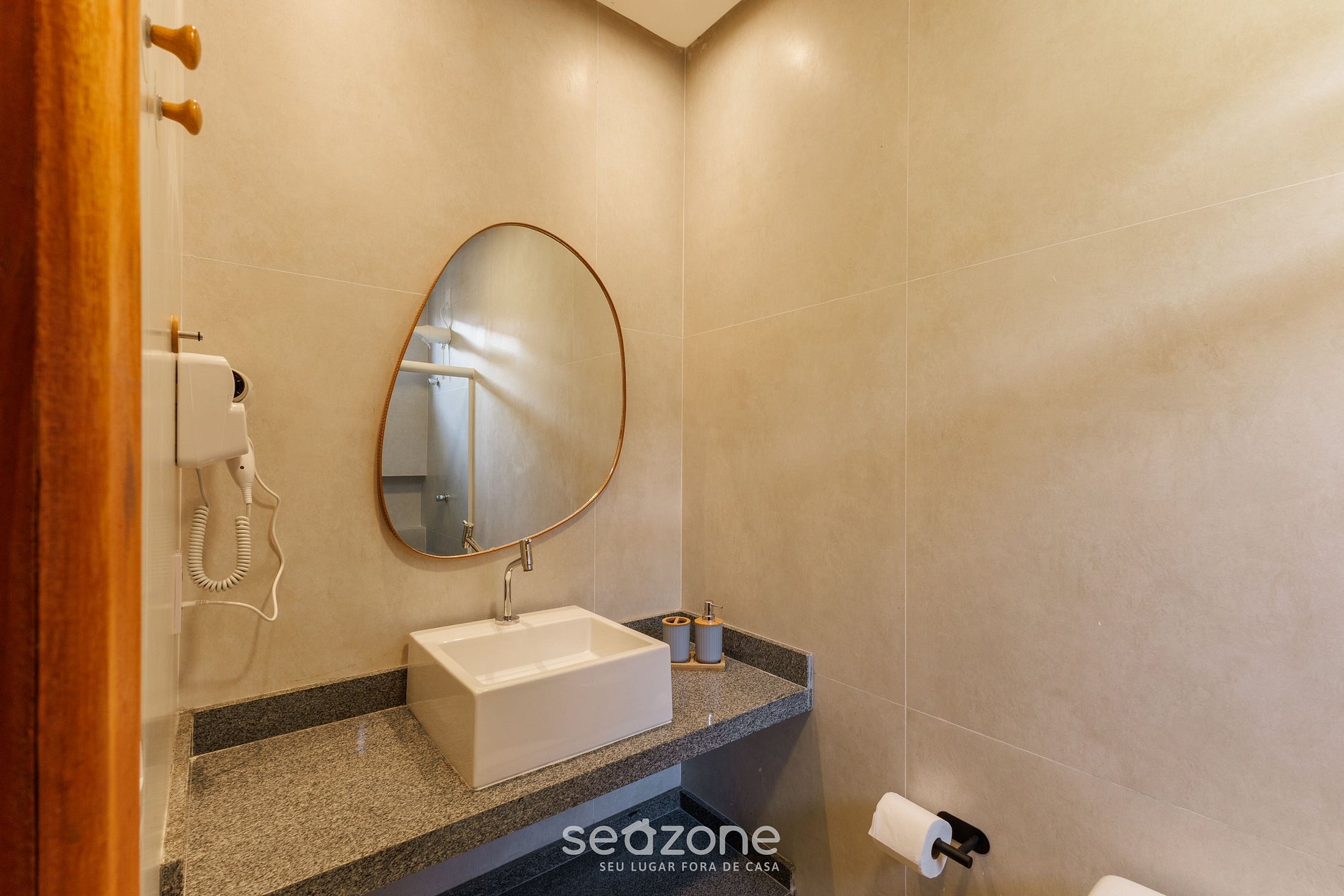 - 1 Suíte com cama de casal, Smart TV, arara para roupas e ar-condicionado;