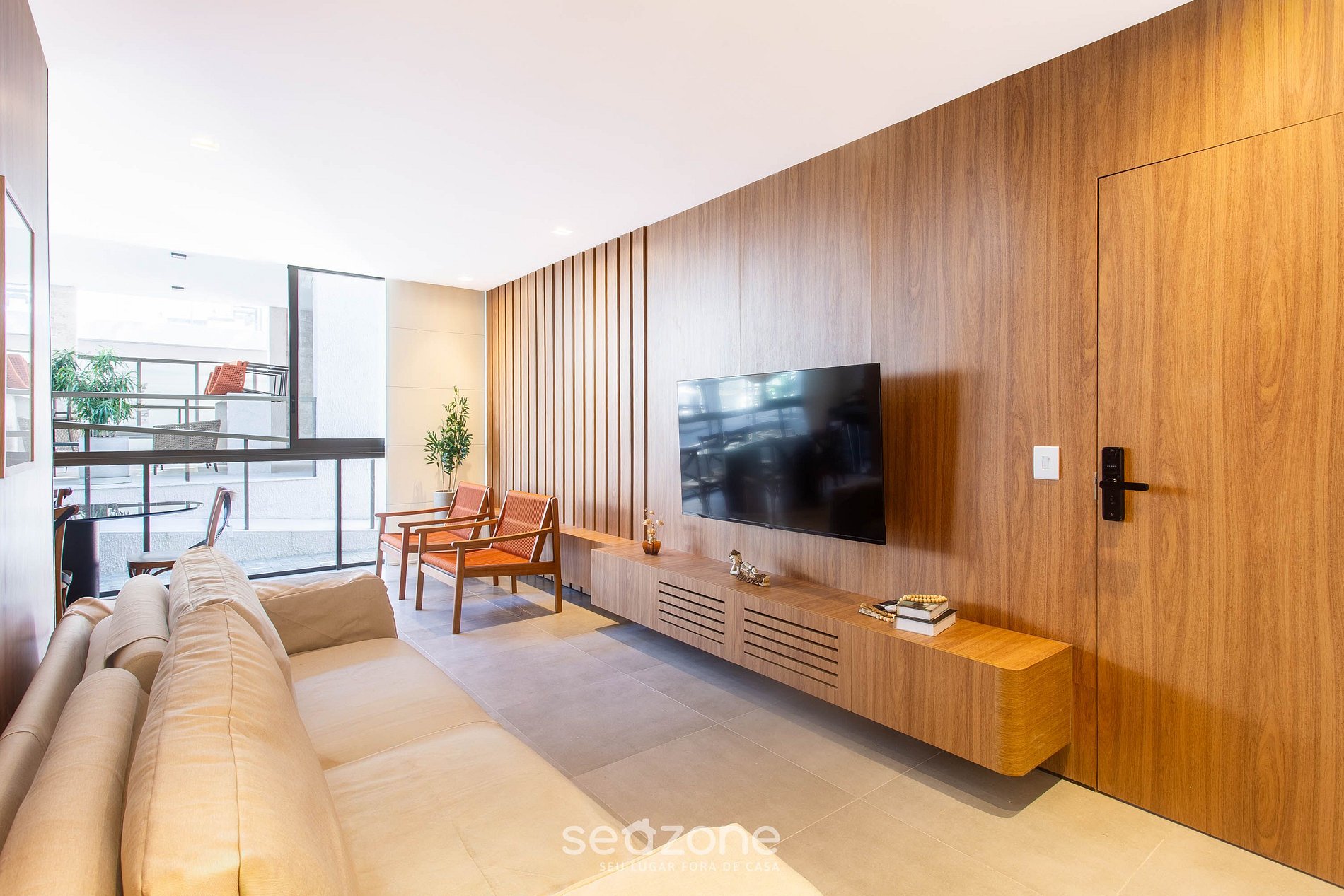 - Sala com sofá e Smart TV, ar-condicionado e cervejeira/adega elétrica;