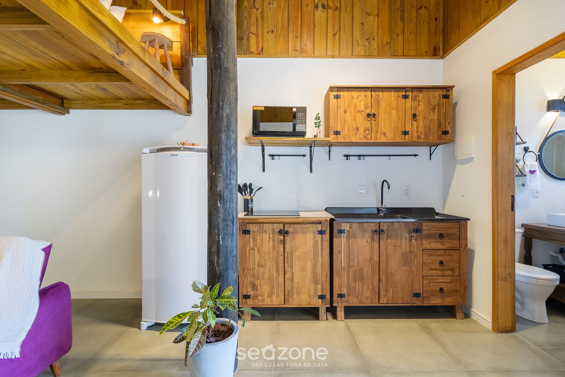 - Mezanino com cama king size e ar-condicionado integrado ao ambiente;