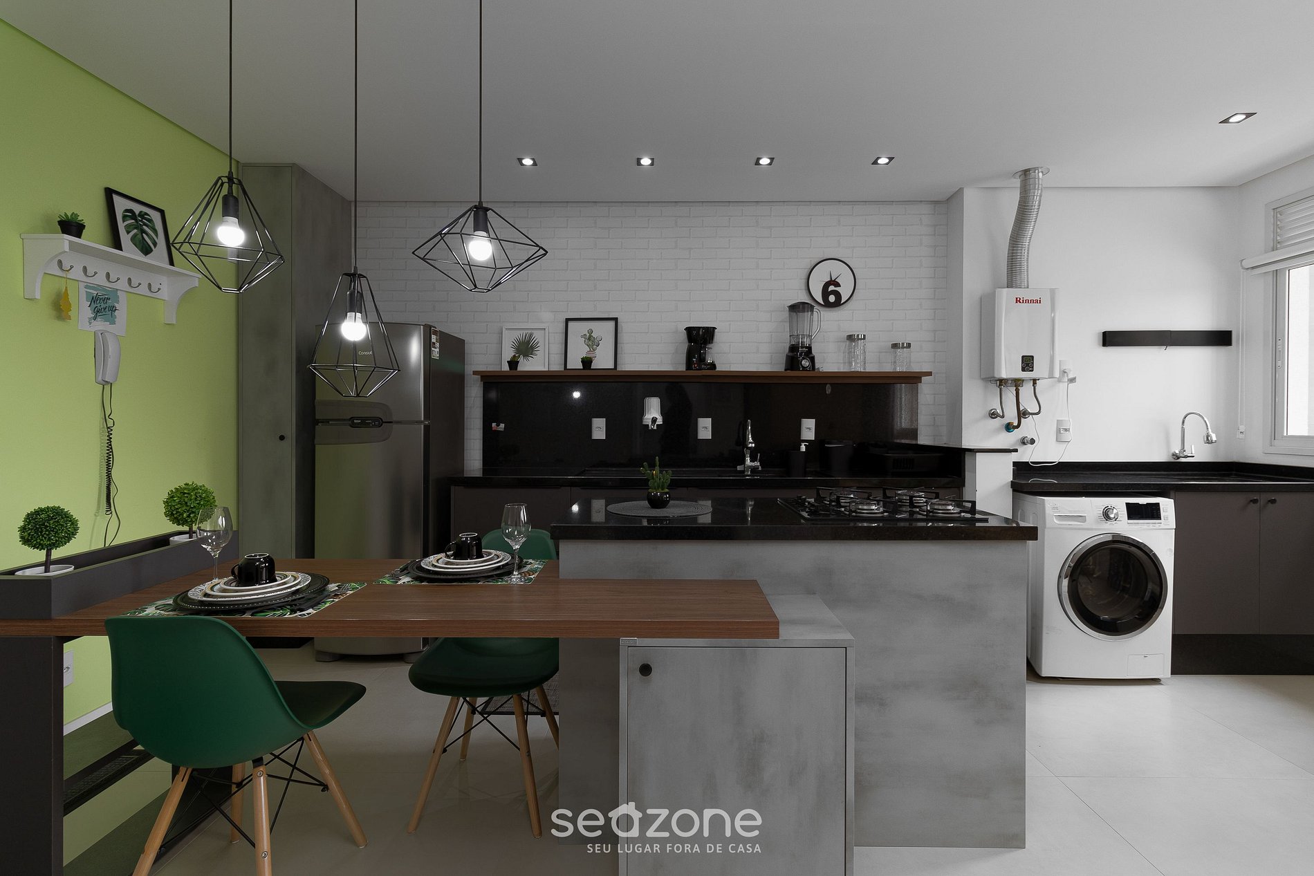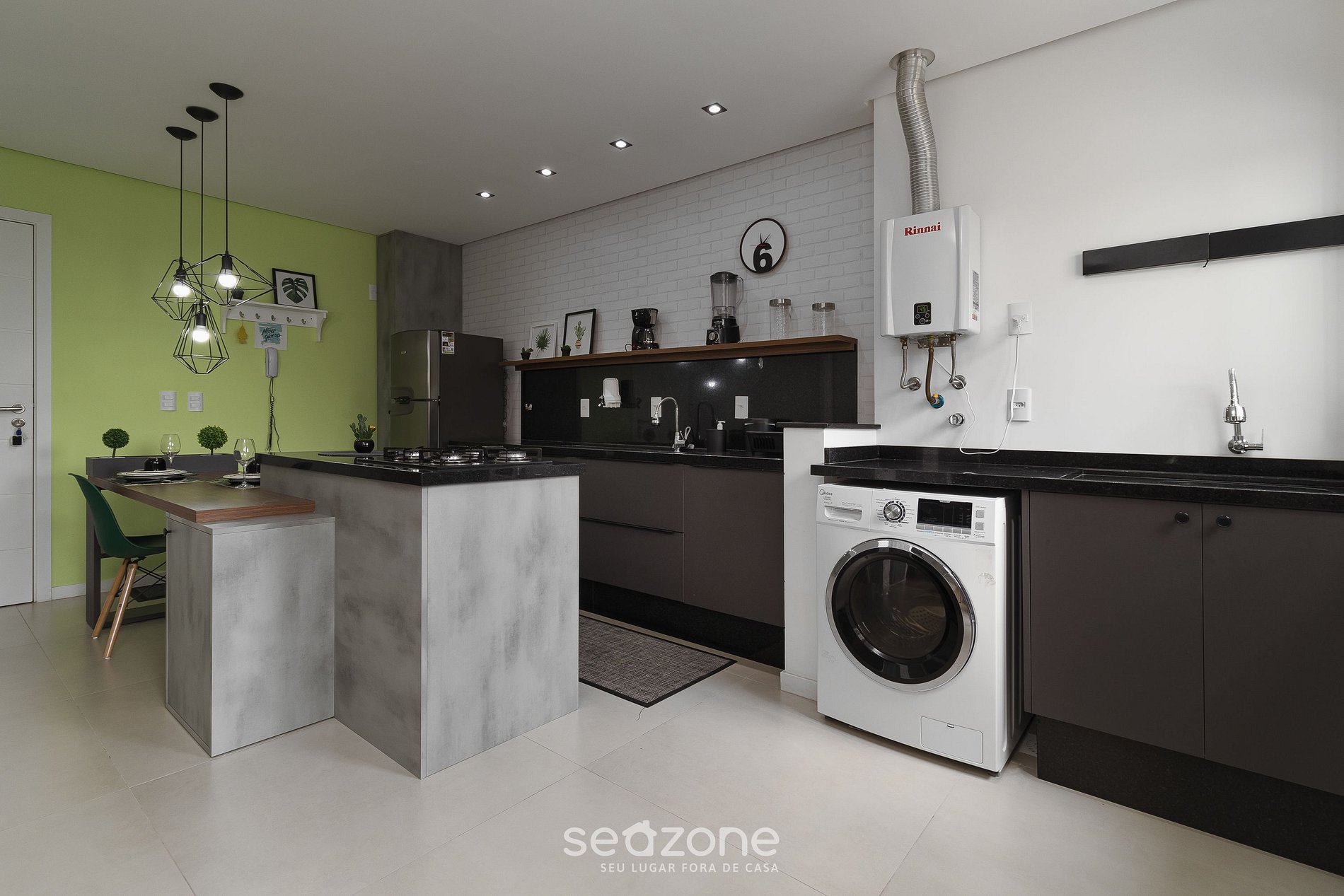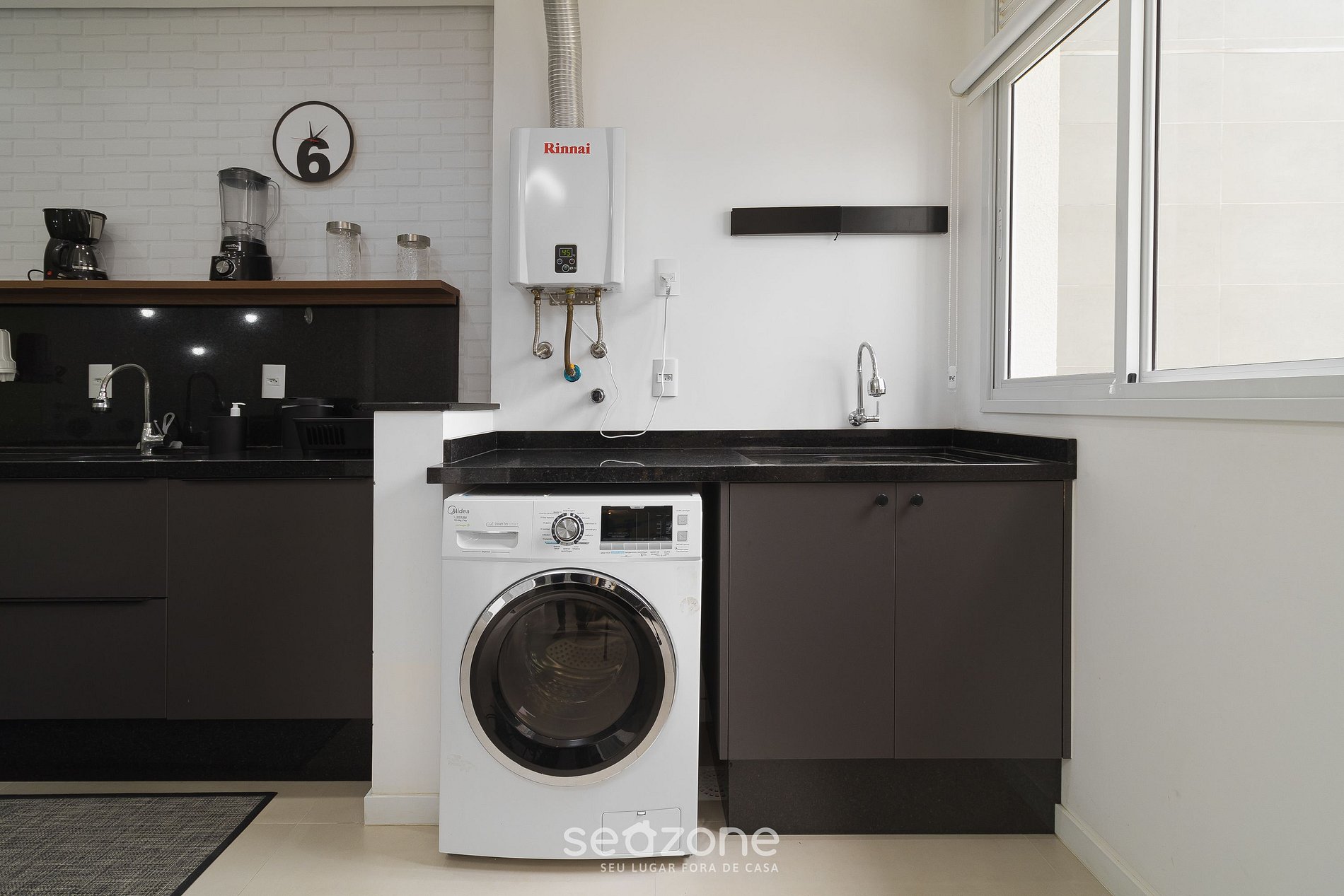 - Área de serviço com máquina de lavar e secar e pia;