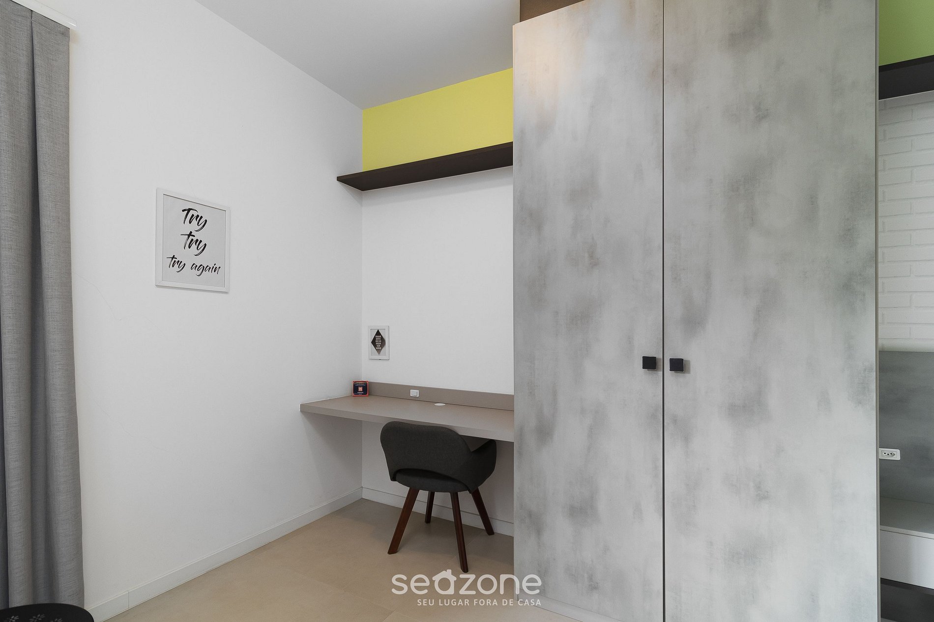 - 1 suíte com cama de casal, armários, mesa de trabalho com cadeira e ar-condicionado;