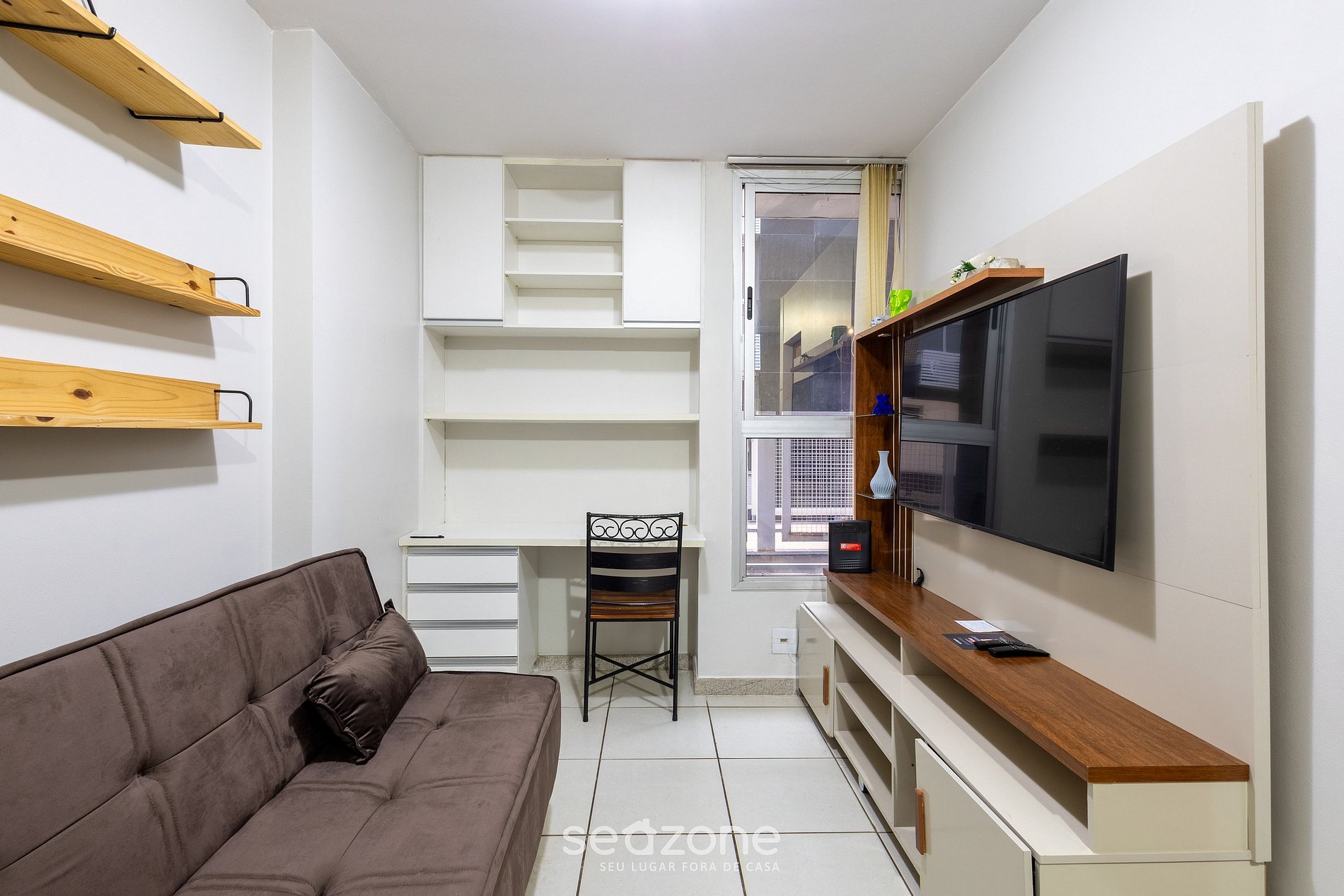 - Sala de estar com sofá, Smart TV e espaço para notebook;