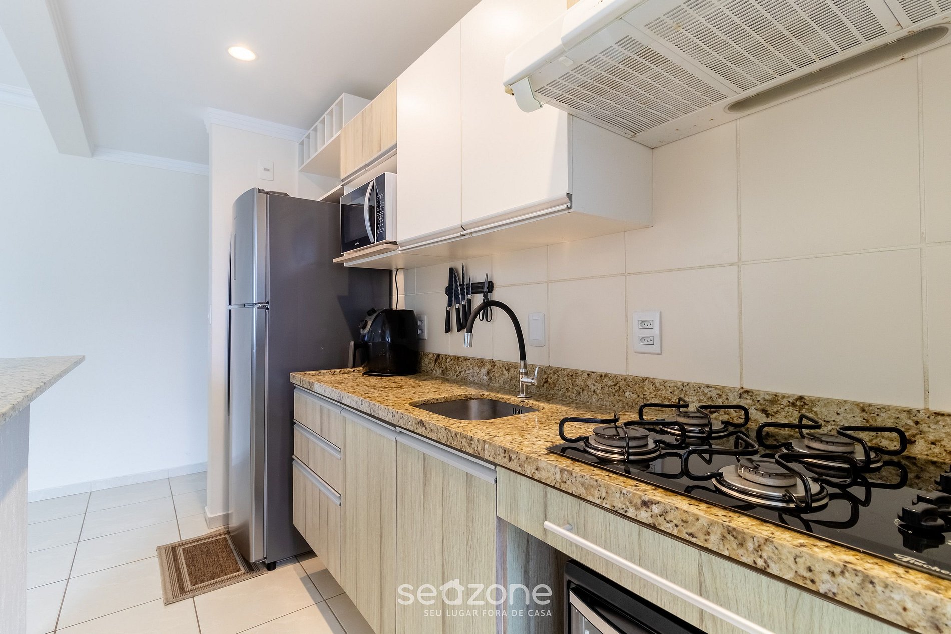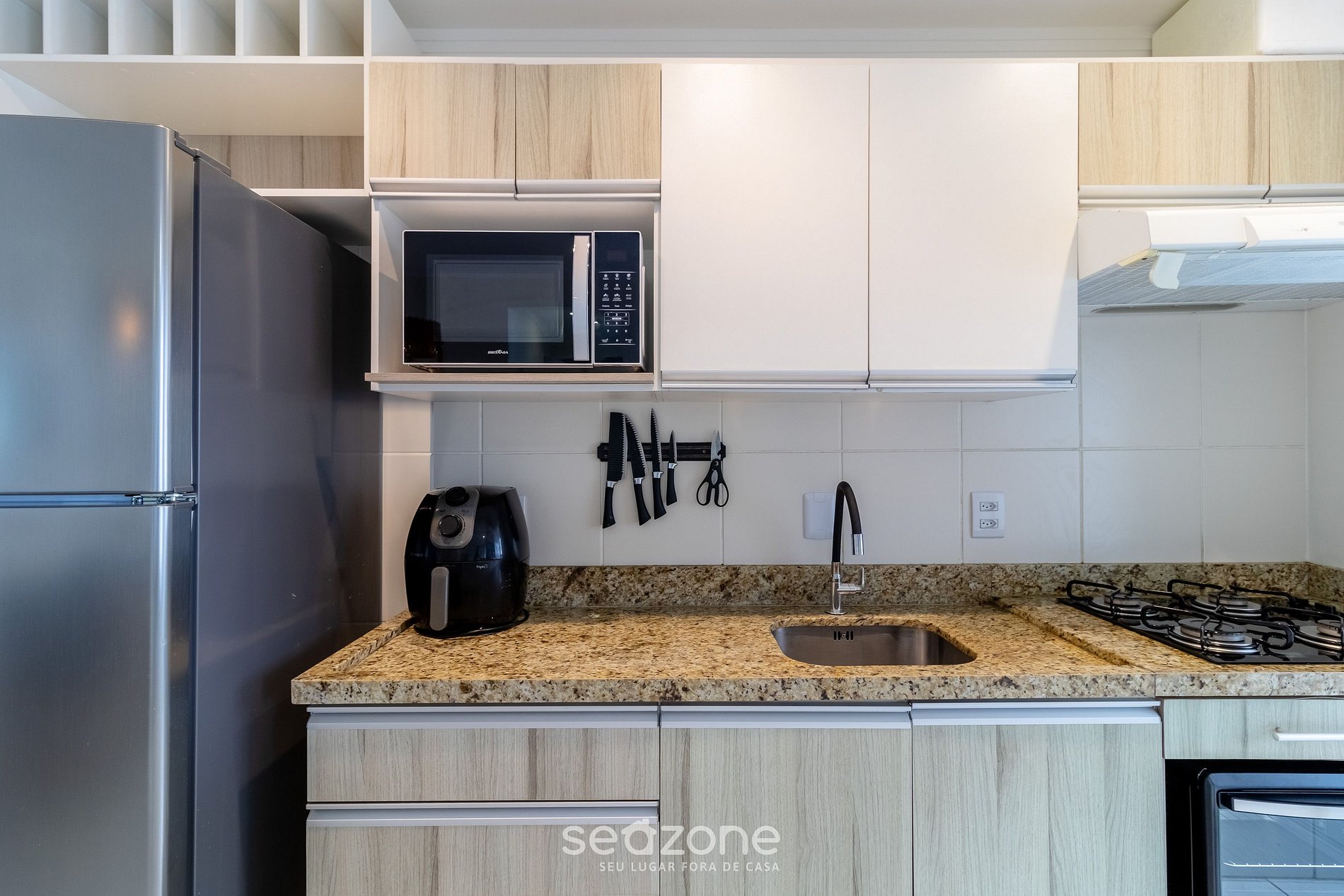 - Cozinha completa com geladeira, fogão cooktop (gás), forno elétrico, airfryer, micro-ondas, sanduicheira, kit café (suporte para filtro, garrafa térmica), chaleira elétrica, liquidificador, taças de vinho, panelas, louças e utensílios;