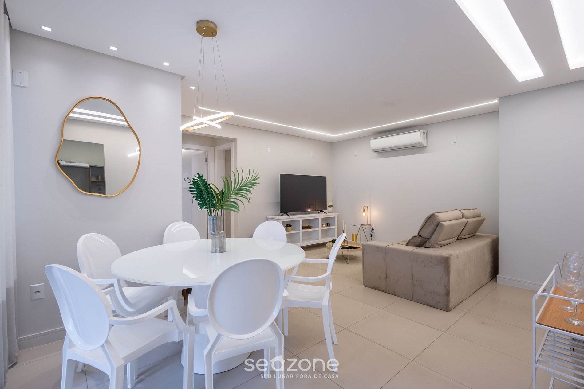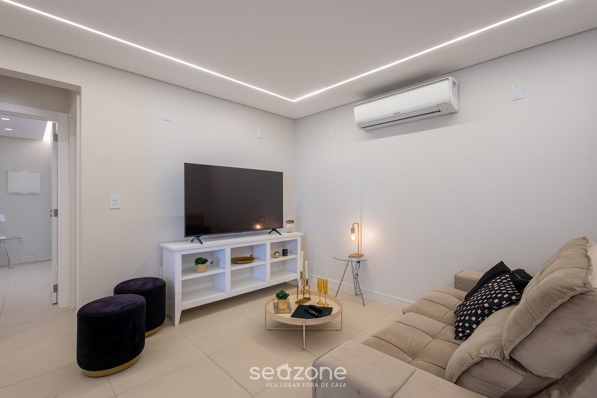 - Sala de estar com sofá, Smart Tv e ar-condicionado;
