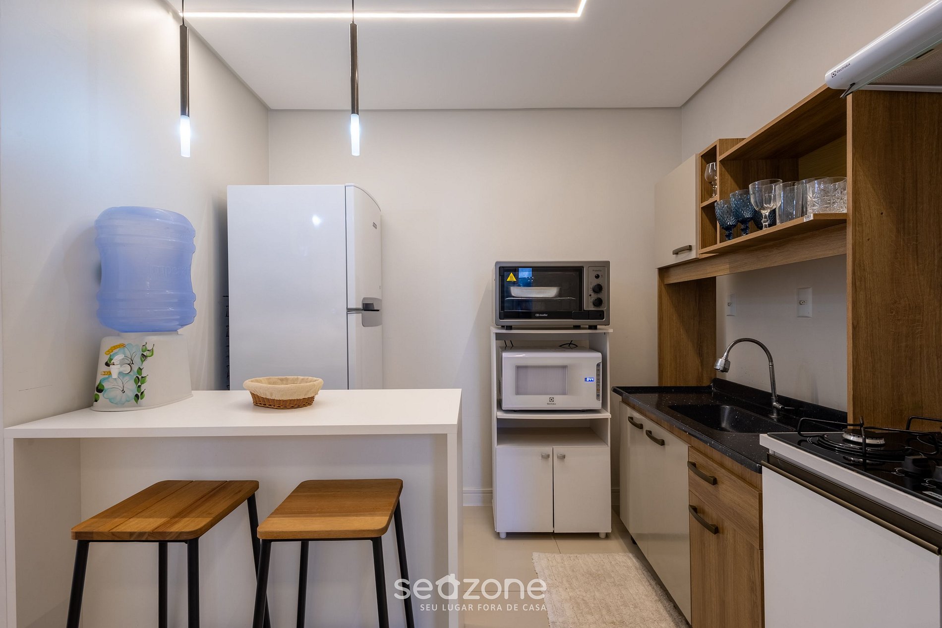 - Cozinha completa com geladeira, fogão cooktop, forno elétrico, micro-ondas, Airfryer, sanduicheira, cafeteira elétrica, chaleira comum (leiteira), liquidificador, taças de vinho, panelas, louças e utensílios;