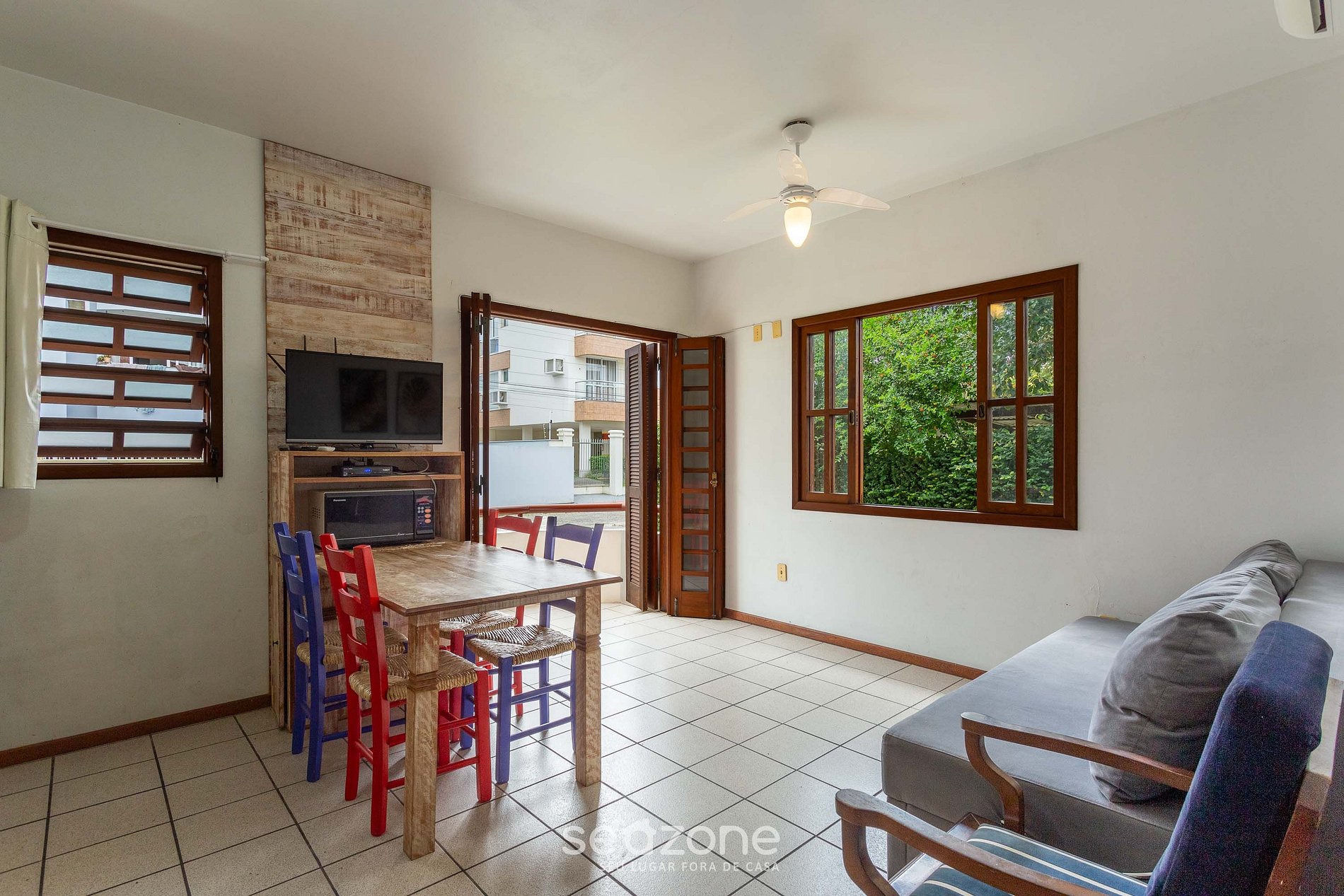 - Sala de estar com sofá-cama (comporta duas pessoas) e TV de tela plana, ar-condicionado e está integrada a cozinha;