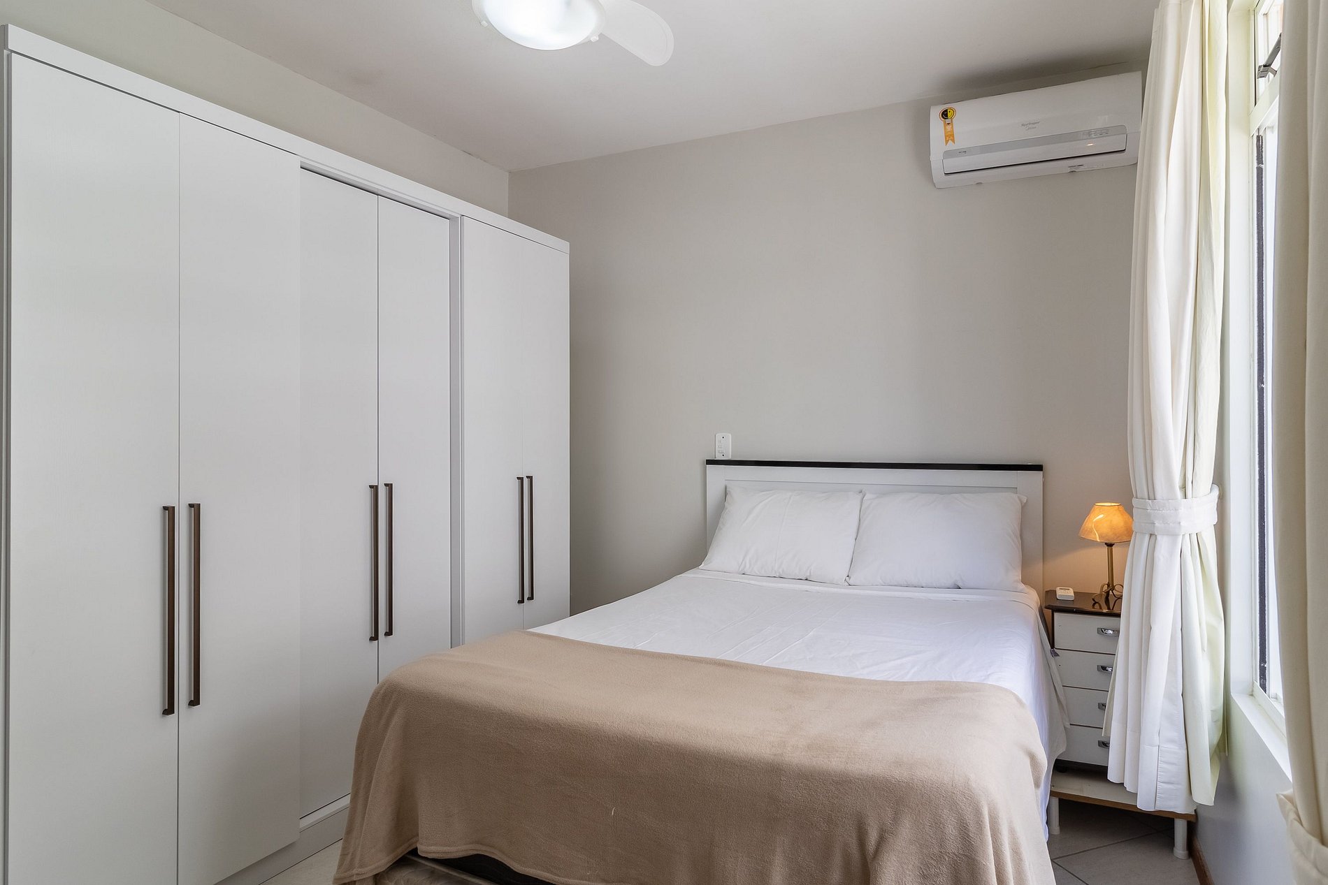 - 1 quarto com cama de casal, armário, mesa de cabeceira, ventilador de teto, cômoda e ar-condicionado;