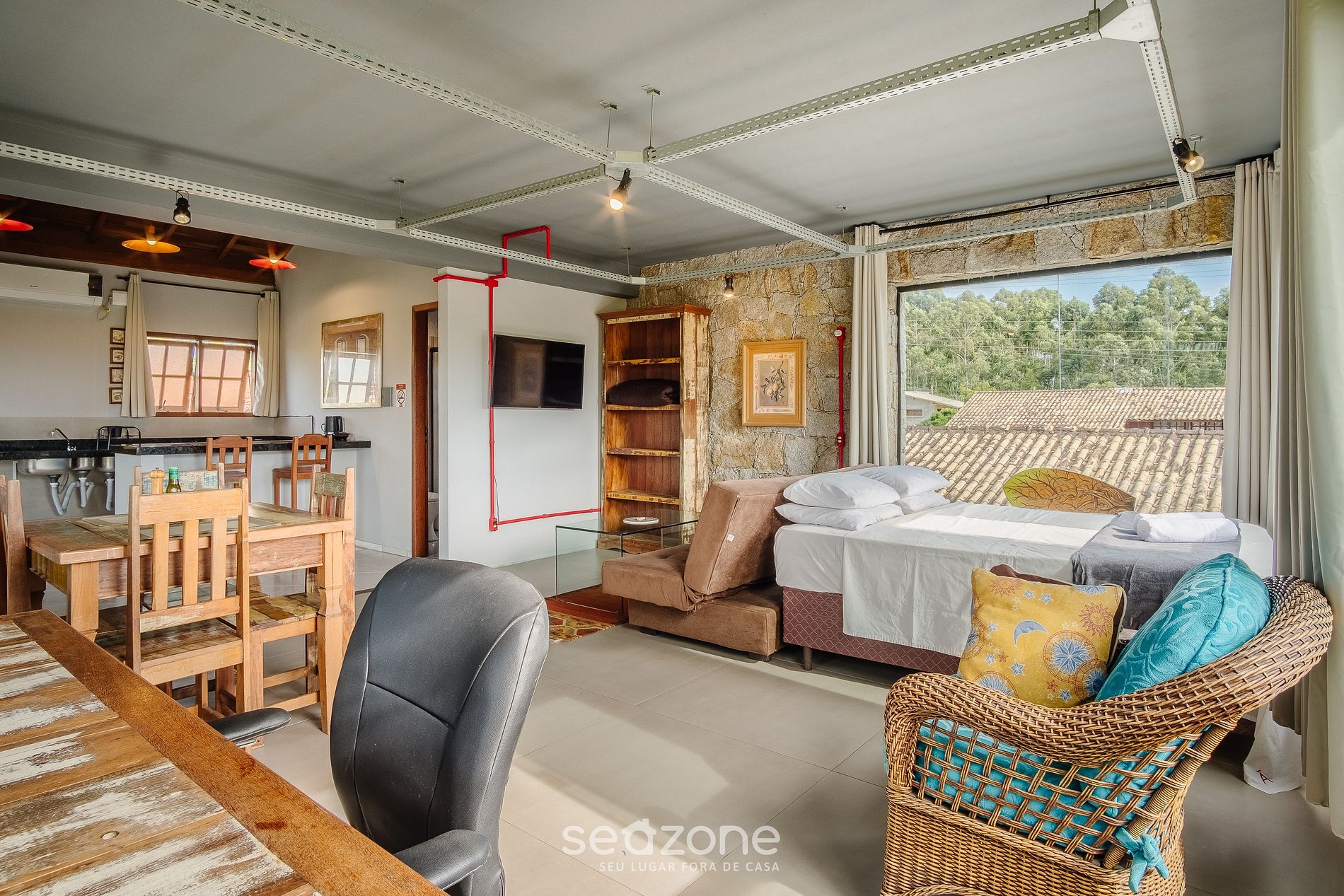 - 1 Cama queen size, sofá-cama casal, poltrona, smart TV e ar-condicionado;