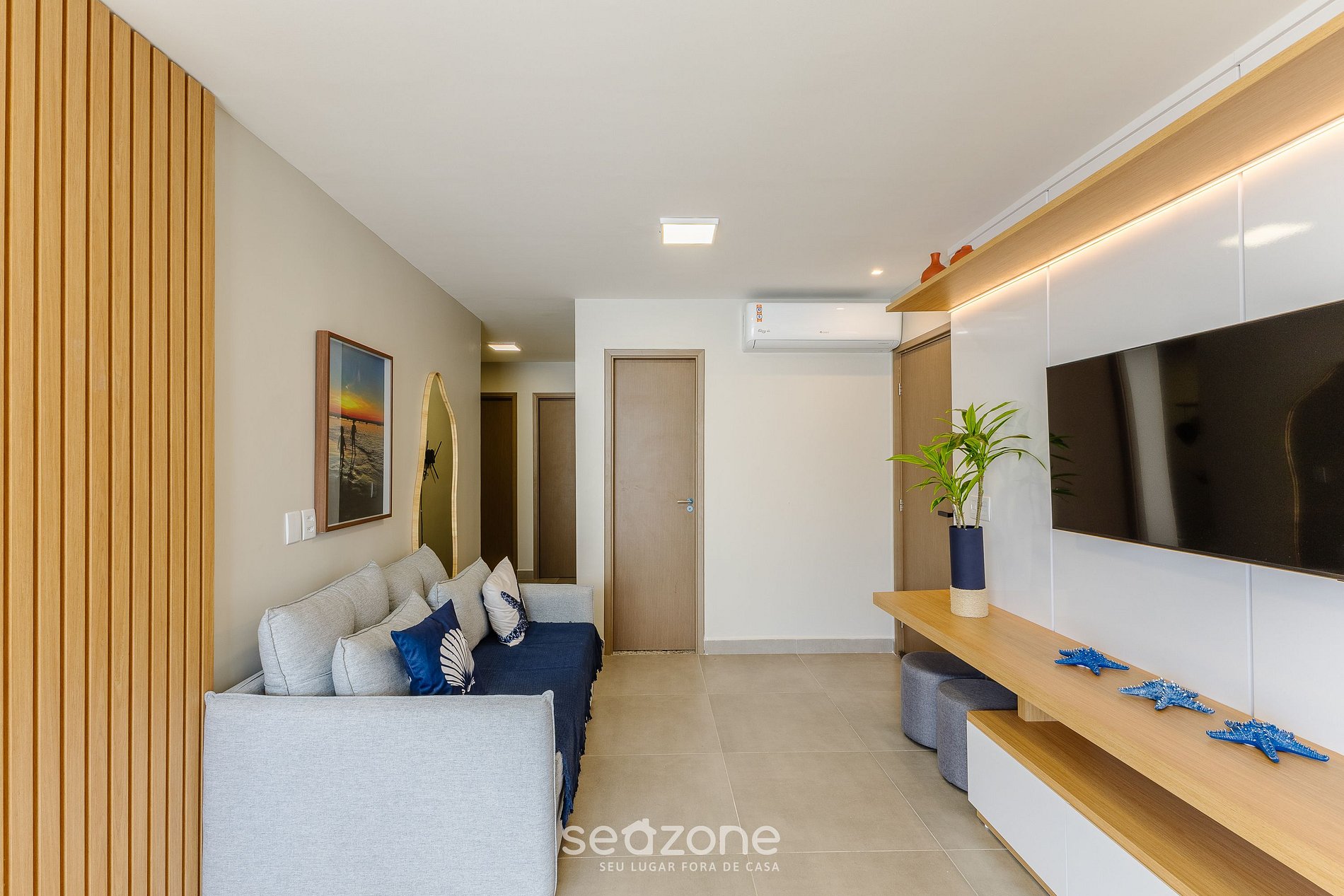 - Sala de estar com sofá-cama, Smart Tv e ar-condicionado;