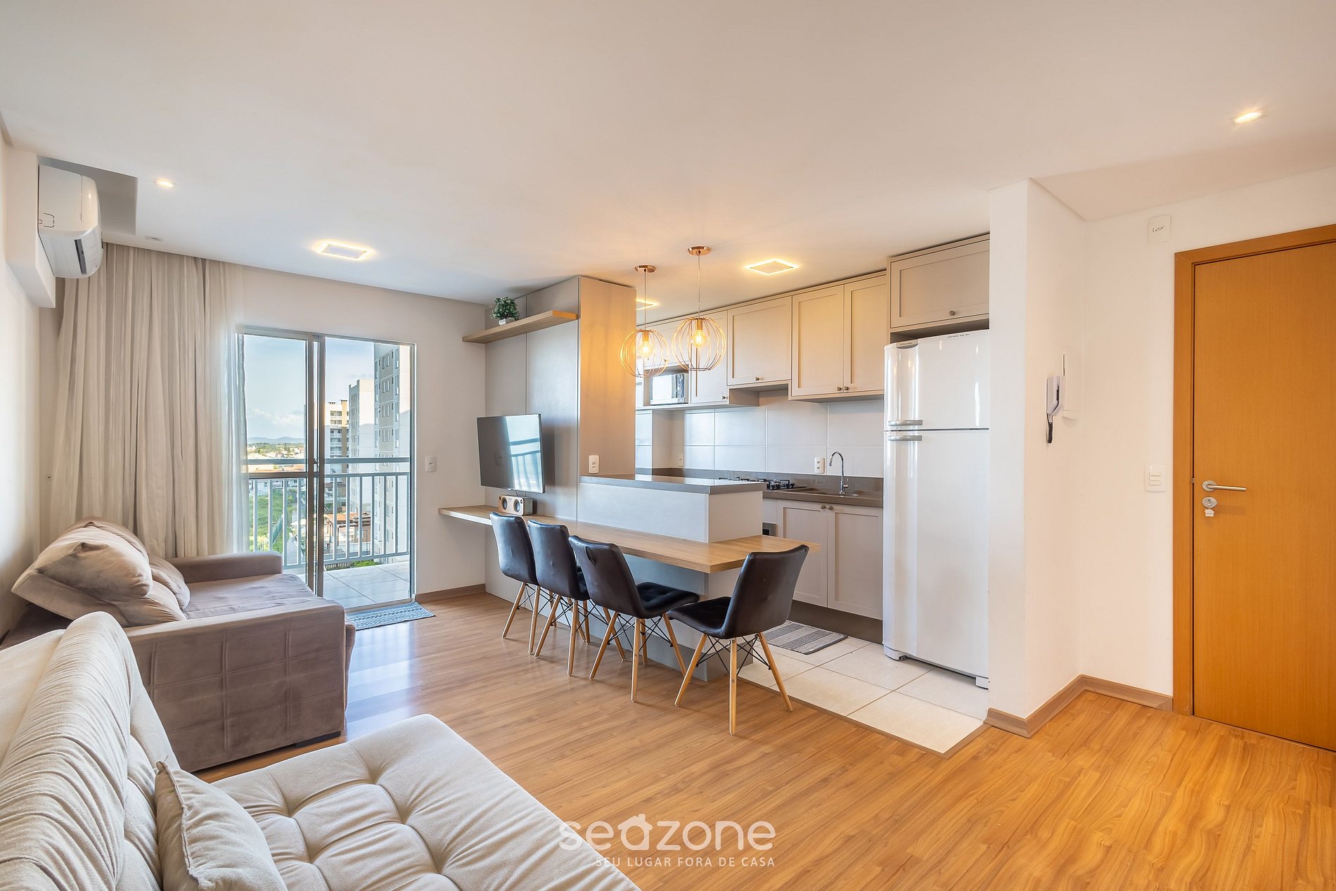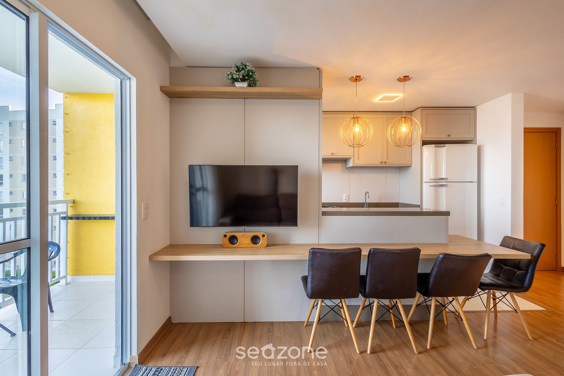 - Sala de estar com sofá-cama de casal, Smart TV e ar-condicionado;