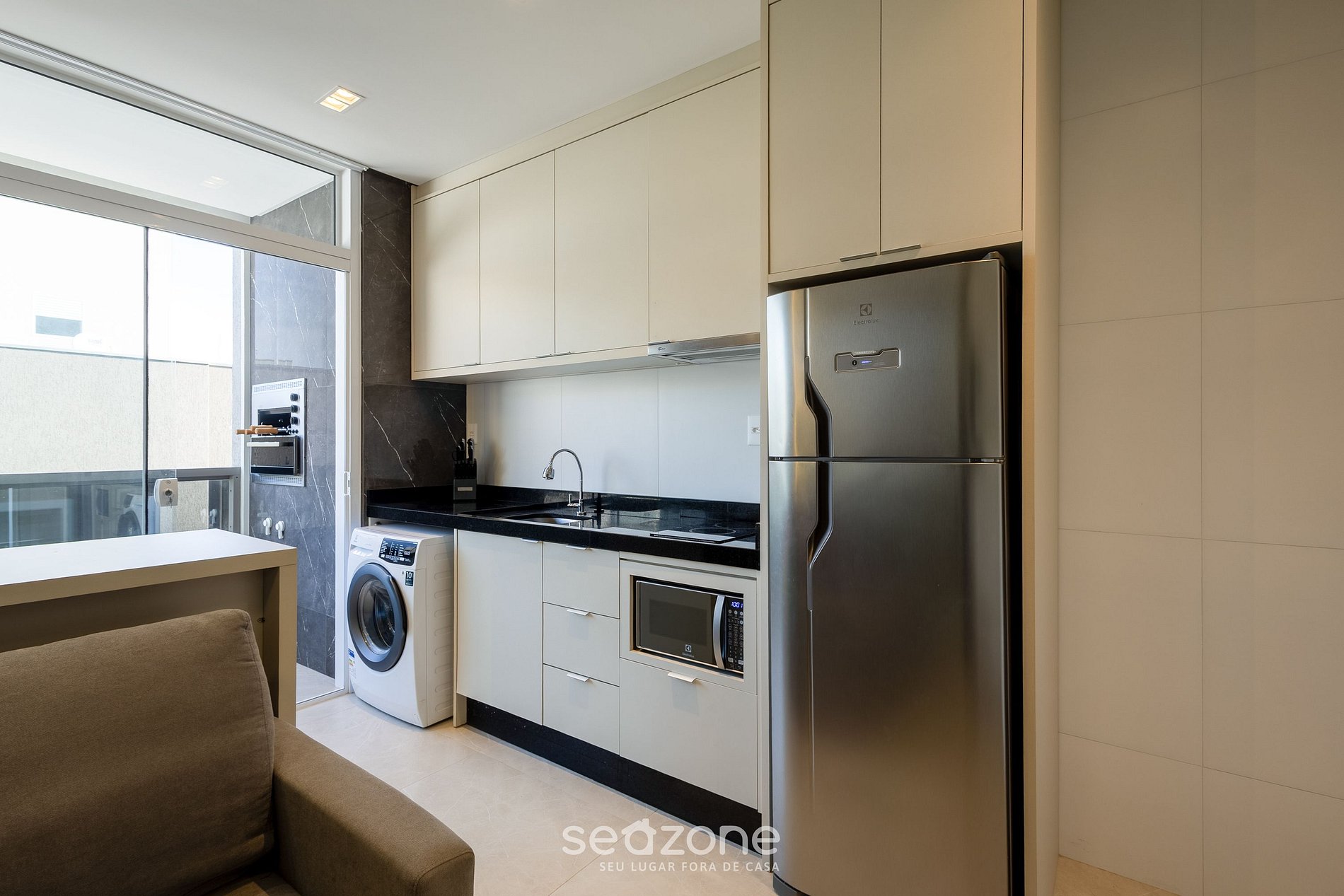 - Cozinha completa com geladeira, cooktop, micro-ondas, sanduicheira, cafeteira elétrica, chaleira elétrica, liquidificador, panelas, louças e utensílios;