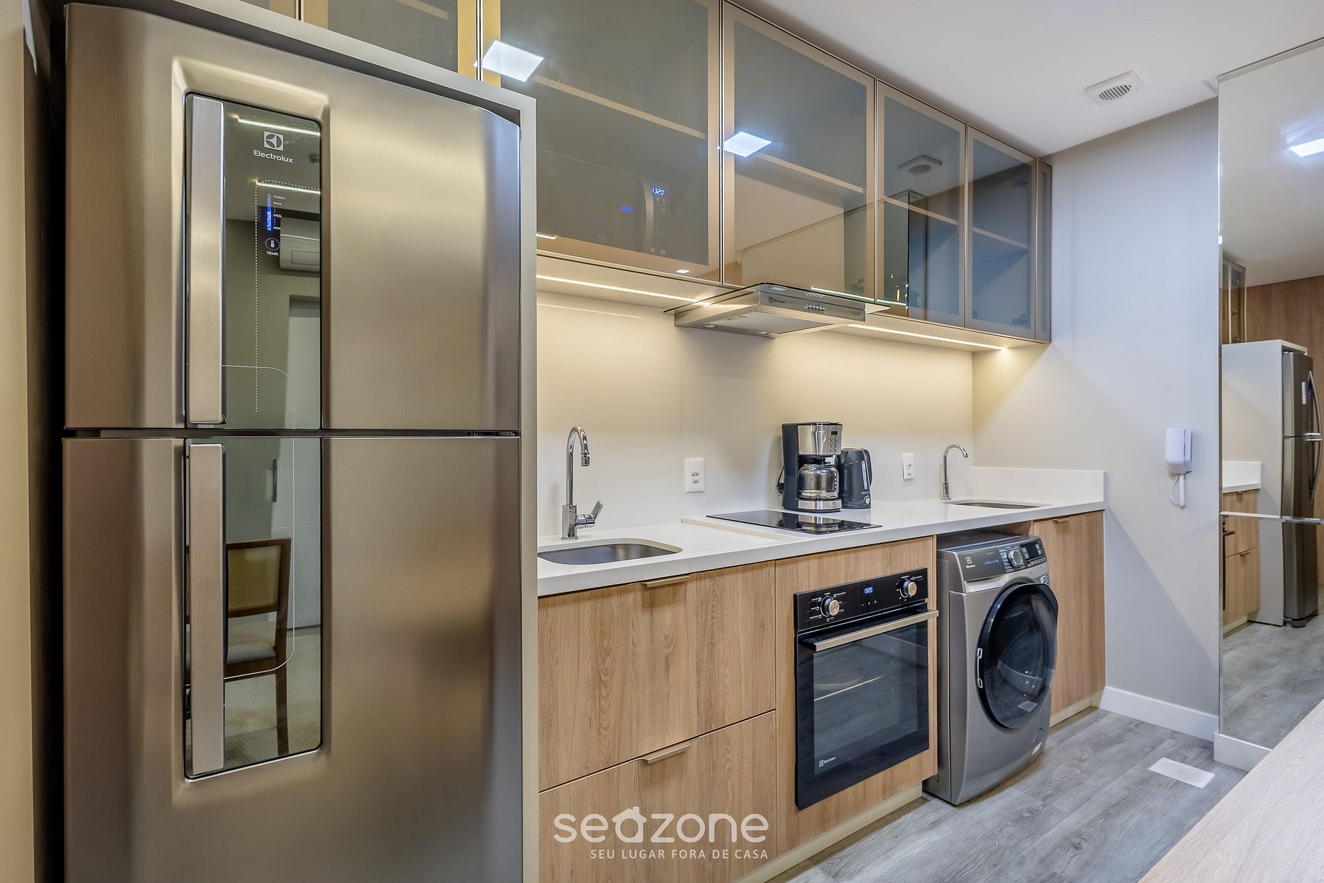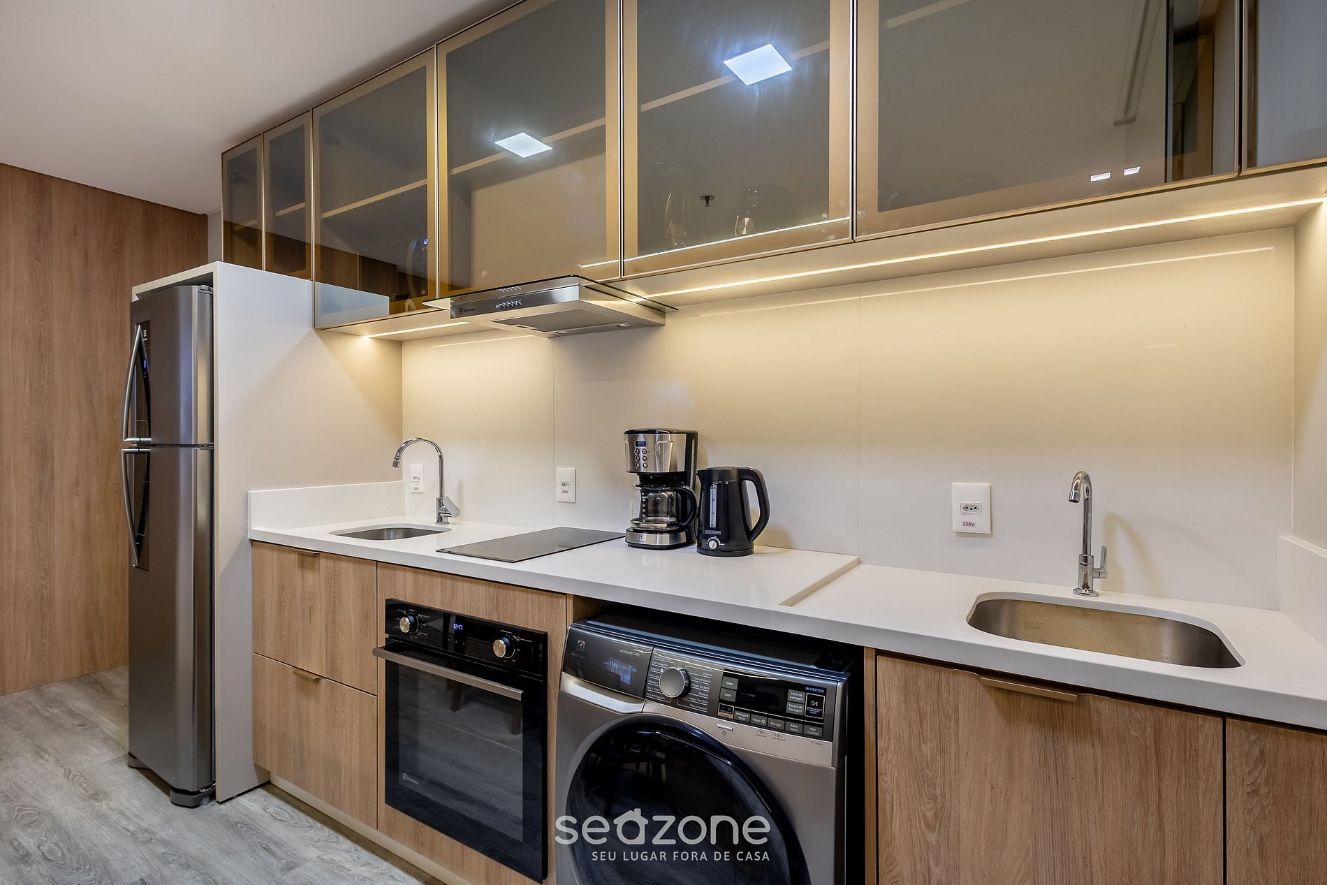 - Cozinha completa com geladeira, fogão cooktop (indução), forno elétrico, micro-ondas, cafeteira elétrica, panelas, louças e utensílios;